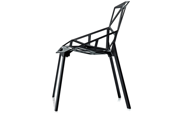 最受瞩目的德国设计师Konstantin Grcic 应邀为MAGIS 设计的Chair One(几何吧椅),是设计生涯中最具有标志的产品之一。办公椅体为模铸铝合金结构,经过氟化钛镀膜与塑料粉末涂布。椅子具有阻燃性、抗腐蚀性。适合室内及室外使用。以铝金属与钛金属制成的 Chair One,以多个平面以不同角度组合而成,建立起立体的外型。多个中空的三角型组合而成的座椅,不但令为用家带来强而有力的承托结构,而且还能在简单设计之中带出不一样的风格。这把椅子的惊人形象难免使人对它的舒适度产生疑问,但当你真正坐于其上,你会发现它实际上非常舒适,那些稀疏的网状结构能够极好地支撑不同体型的人体,后背上的把手也非常实用。当你知道Chair-One最初是被当作户外用椅而设计的,你会更加佩服Konstantin Grcic的缜密用心:极少的表面可以杜绝雨水,并且减少灰尘堆积,夸张的形态则令它能够在街道、建筑或自然的环境中拥有自己美学上的存在,而不是被环境所吞没。Konstantin Grcic花了三年时间设计Chair One,自2003年诞生以来,堪称Grcic精简主义风格的代表作。2006年,Chiar One为Konstantin Grcic赢得了德国政府的设计大奖。