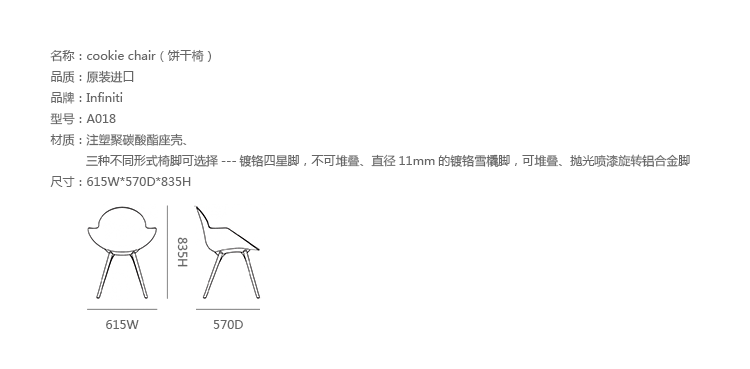 Cookie是工作室Zetass为Infiniti公司设计的椅凳系列,包括Cookie Swivel Chair(饼干旋转椅)及Cookie Chair(饼干椅),光亮、色彩活泼、别具风格并充满活力,是具有独特个性,充满活力的椅子。美丽充满力量的造型,给人以无限安慰感,非常适合室内使用,引领室内设计领域的新趋势。Cookie轮廓鲜明,线性流畅。注塑聚碳酸酯座壳,有红白黑等颜色可选,同时有三种不同形式椅脚可选择---镀铬四星脚,不可堆叠、直径11mm的镀铬雪橇脚,可堆叠、抛光喷漆旋转铝合金脚,Cookie细腻而不丢失任何其独创性和个性,创造了一种轻盈的感觉。
