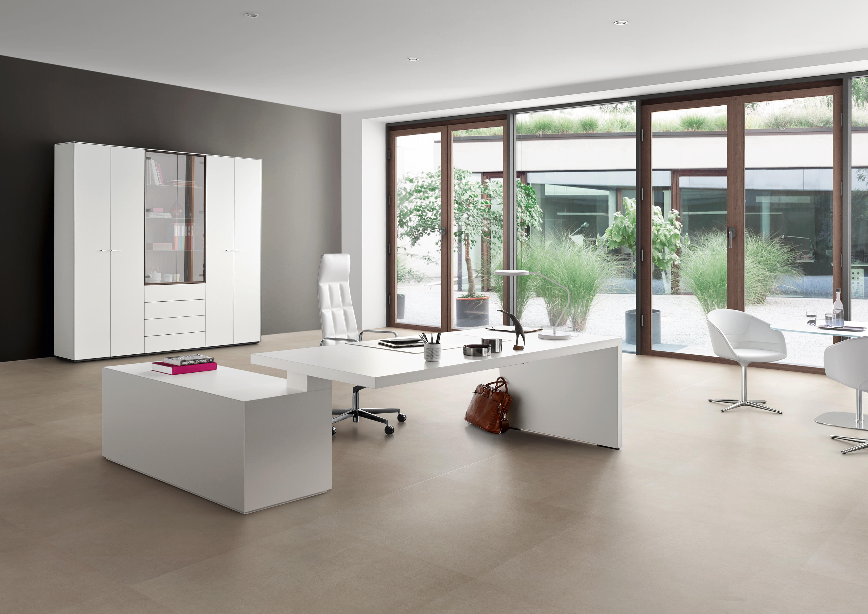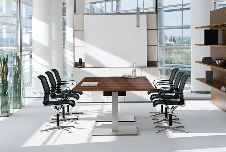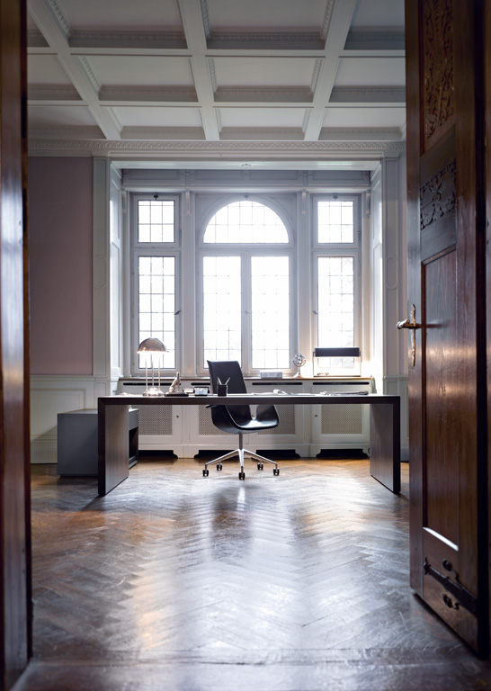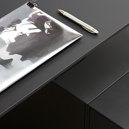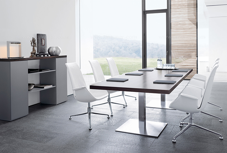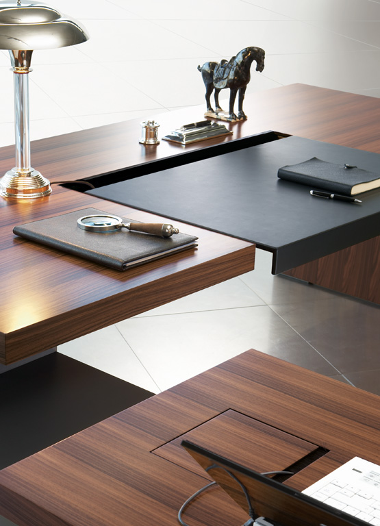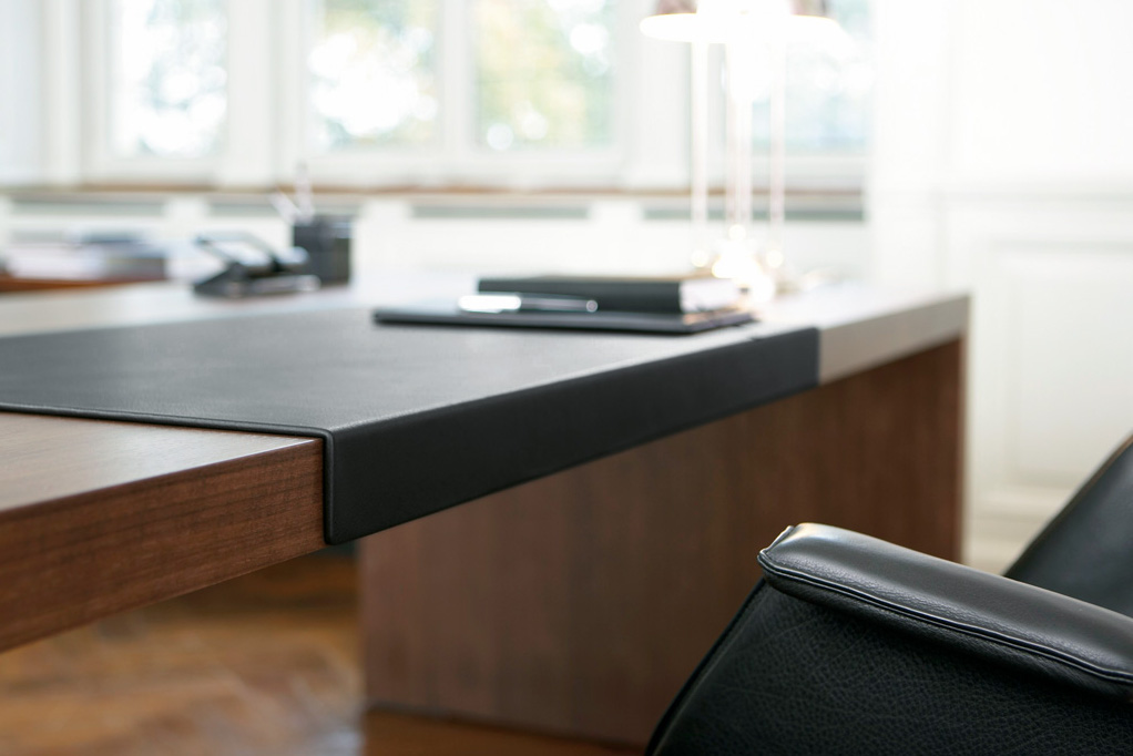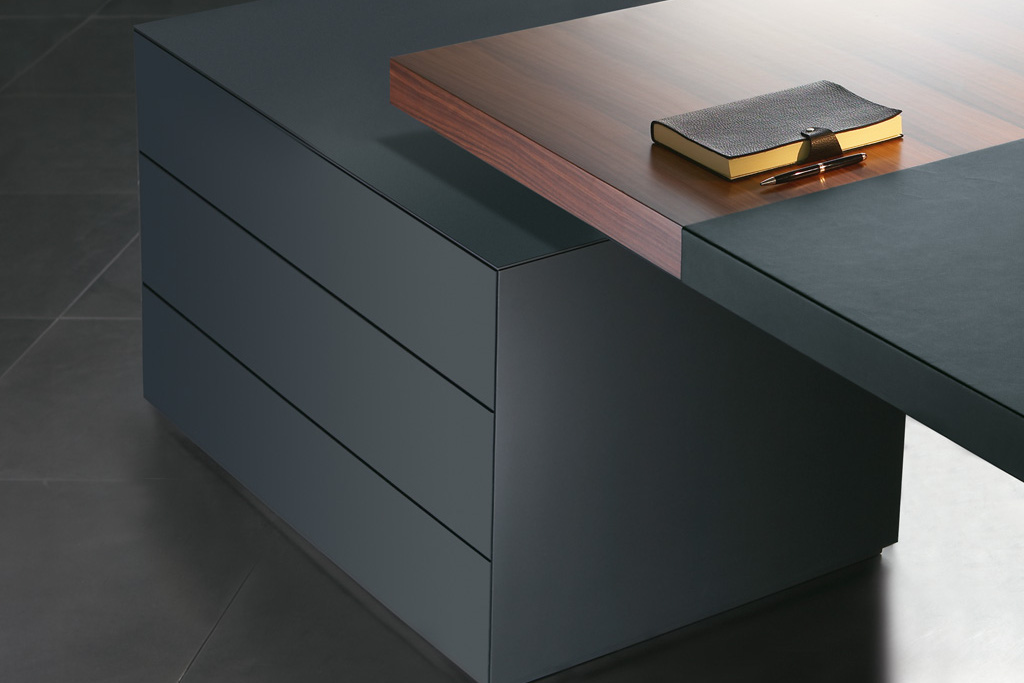 桌面和侧面,水平和垂直形成一个均匀的结构,是Headoffice Mono系列会议项目设计团队所执行的结构概念。强大的线条与精选材料的优雅相结合。由侧面和桌面所制成的直角,中间的桌子上有醒目皮革包裹的面板,如果有需要,可以使用滑动皮板来打开集成线路。电缆布线隐藏在桌面和副柜之间。