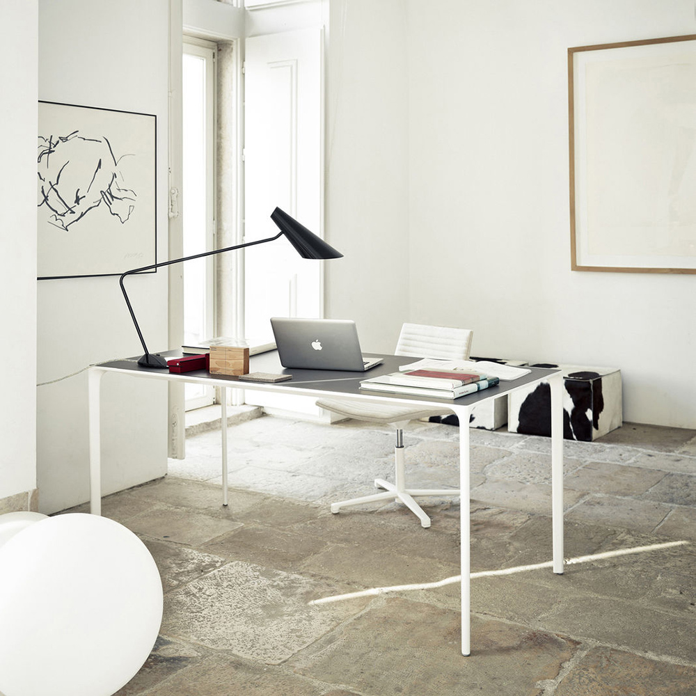 Nuur有方形或矩形两种形式,层压顶部有多种颜色可供选择,也可采用木饰面板制成。 高度可调节的结构采用抛光或涂漆铝制。