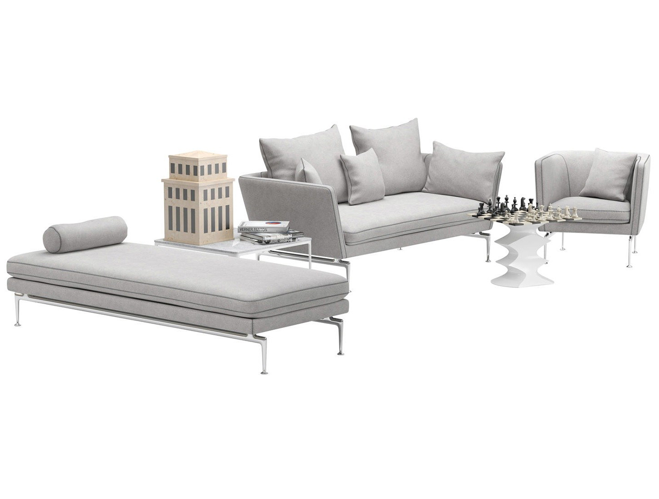 an elegant, timeless sofa system from Vitra and Antonio Citterio that is at once lightweight and technical. The precise geometry and soft padding of the body seem to float above the sleek, aluminum legs echoing classic, mid-century American design. Featuring individual components that can be freely combined, Suita adapts to suit all kinds of design visions, individual styles and environments.