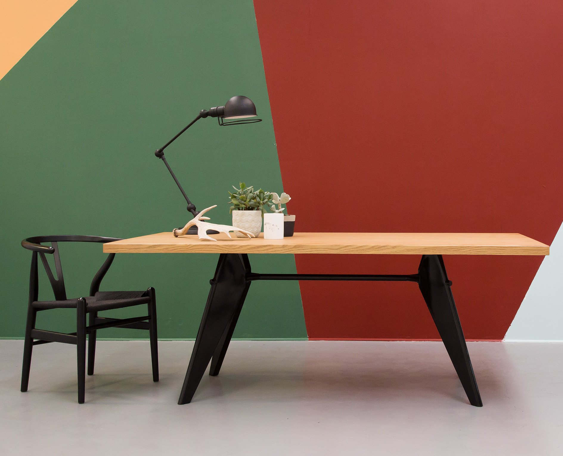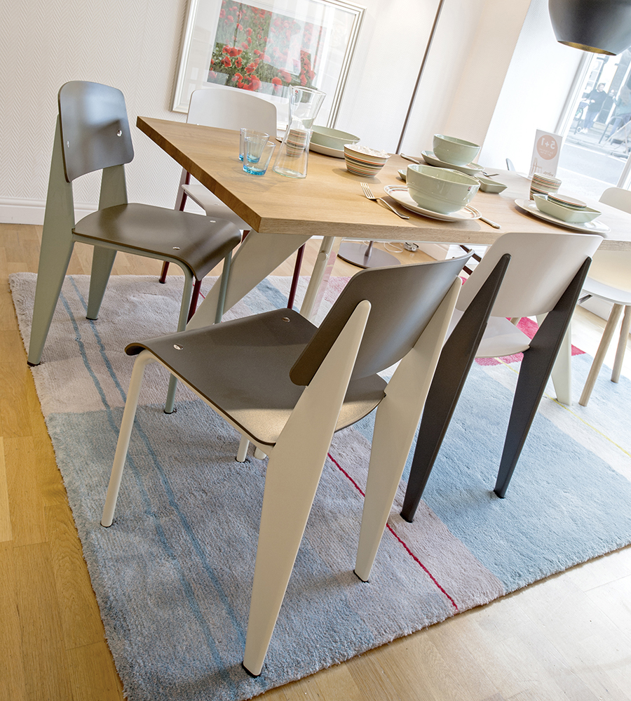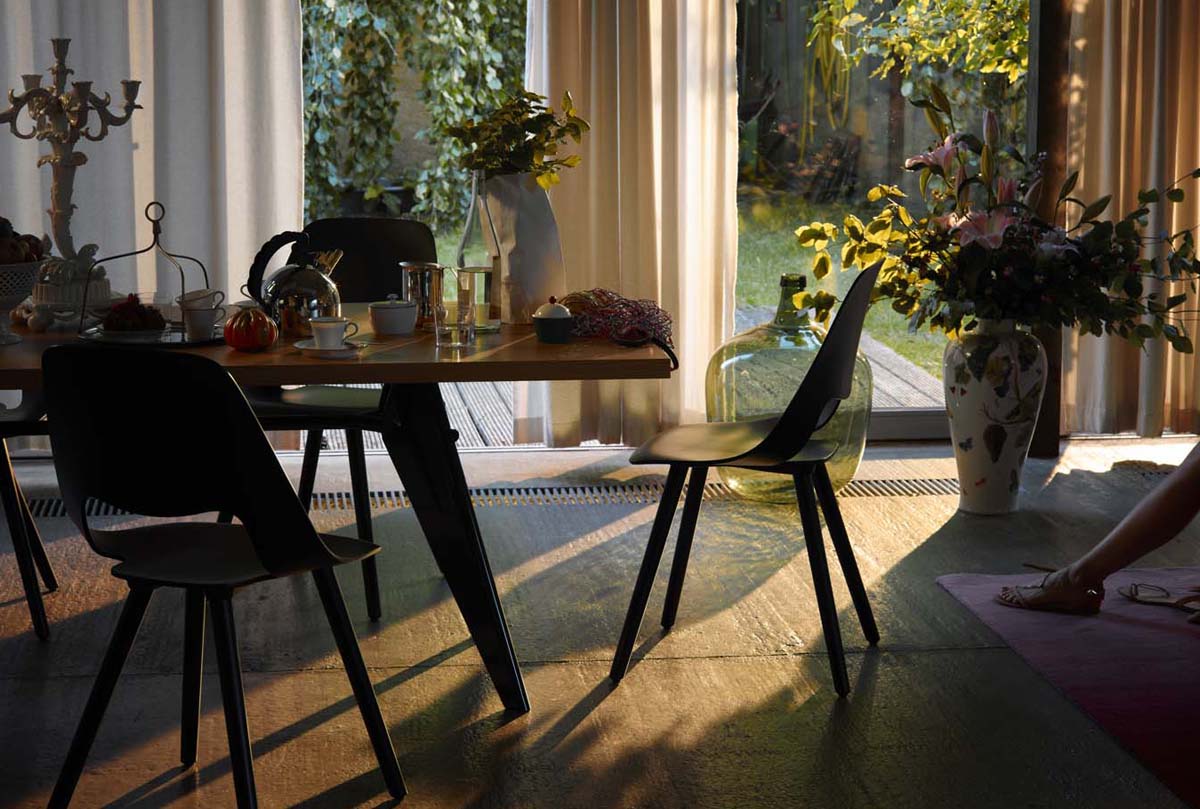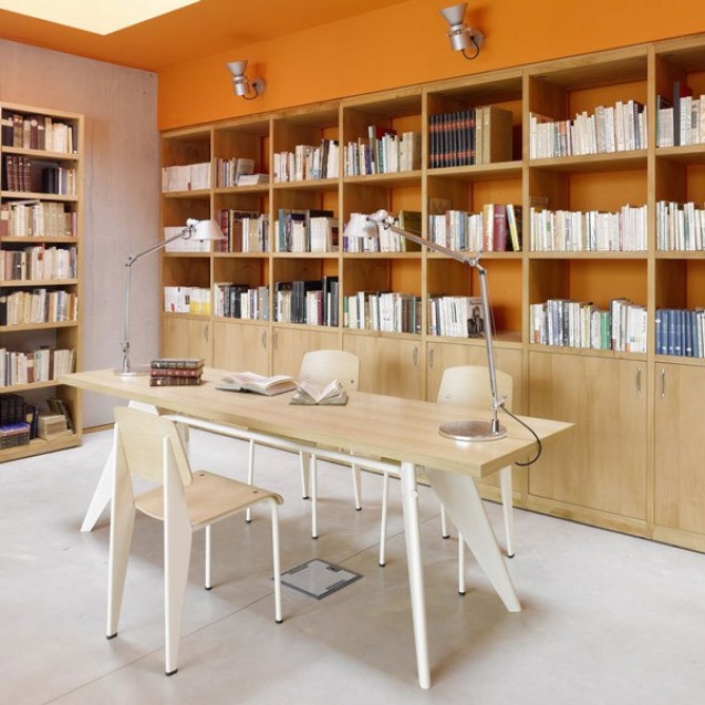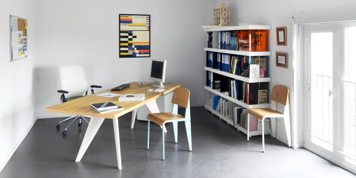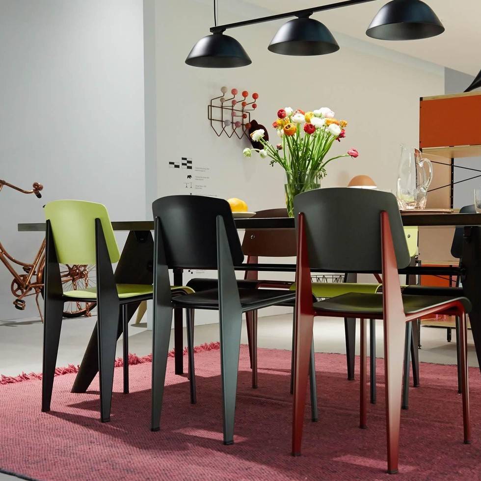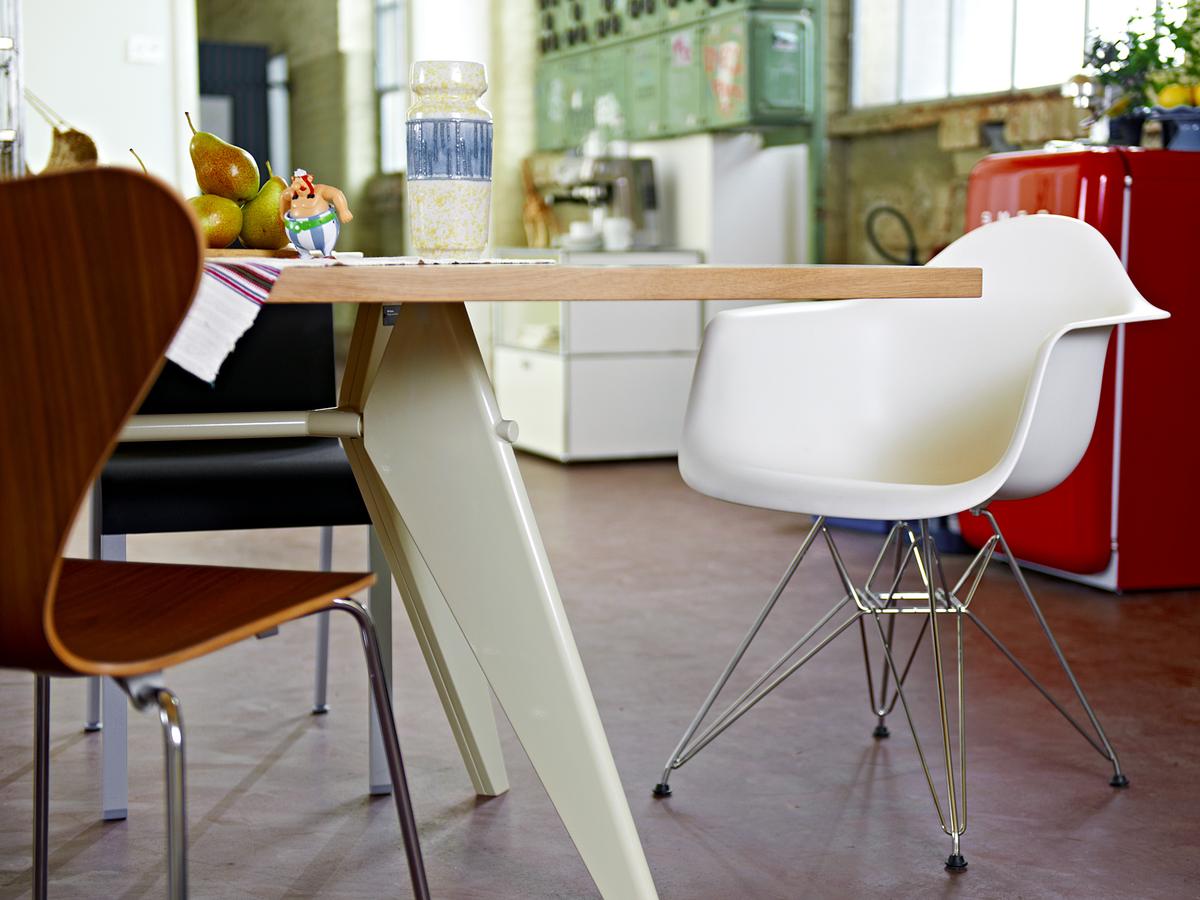 JeanProuvé的EM Table的美学外观坚持结构原则,说明其结构中的力和应力流动。 它有各种尺寸,桌面采用优质实木或HPL层压板,颜色可供选择。 长度为2000或2400毫米的顶部也有橡木贴面。 由于这种广泛的选择,每个餐厅都可以找到理想的EM Table。