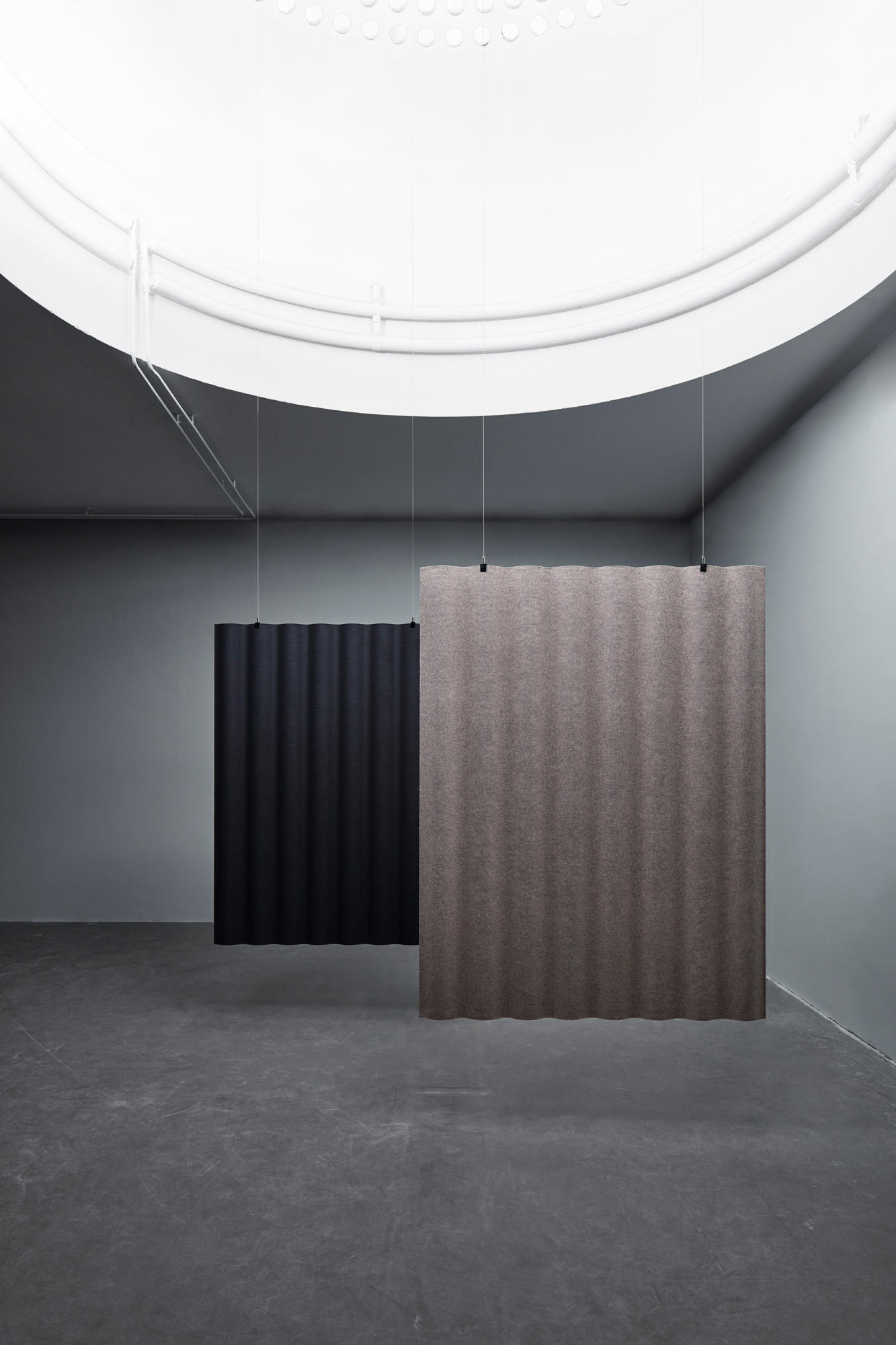 吊顶式可配备集成照明,白色或黑色染色灰。Scala 100%可回收。该面料经欧盟生态标签认证。