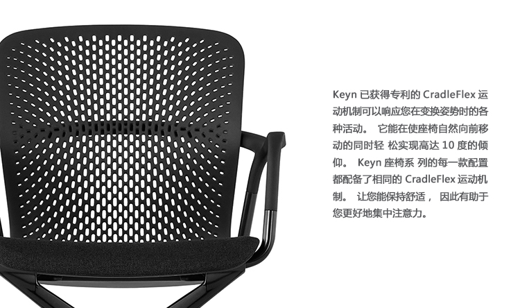 Keyn座椅系列是一套会议和单椅的组合,能为协作式的空间提供响应式的运动机制和即时的舒适感。由伦敦设计团队forpeople设计的这款产品,使用了四个关键部件来创作此系列中的每个型号的产品,所以每款产品都能保持一样的视觉吸引力。Keyn的CradleFlex运动机制能响应姿势的变换,倾仰角度可达10度,能为您带来令人愉悦的舒适感