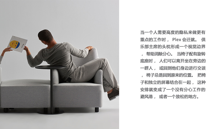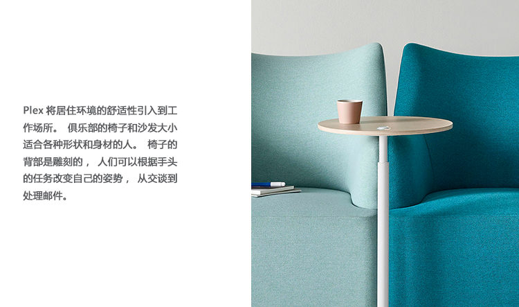 Plex将居住环境的舒适性引入到工作场所。俱乐部的椅子和沙发大小适合各种形状和身材的人。椅子的背部是雕刻的,人们可以根据手头的任务改变自己的姿势,从交谈到处理邮件。