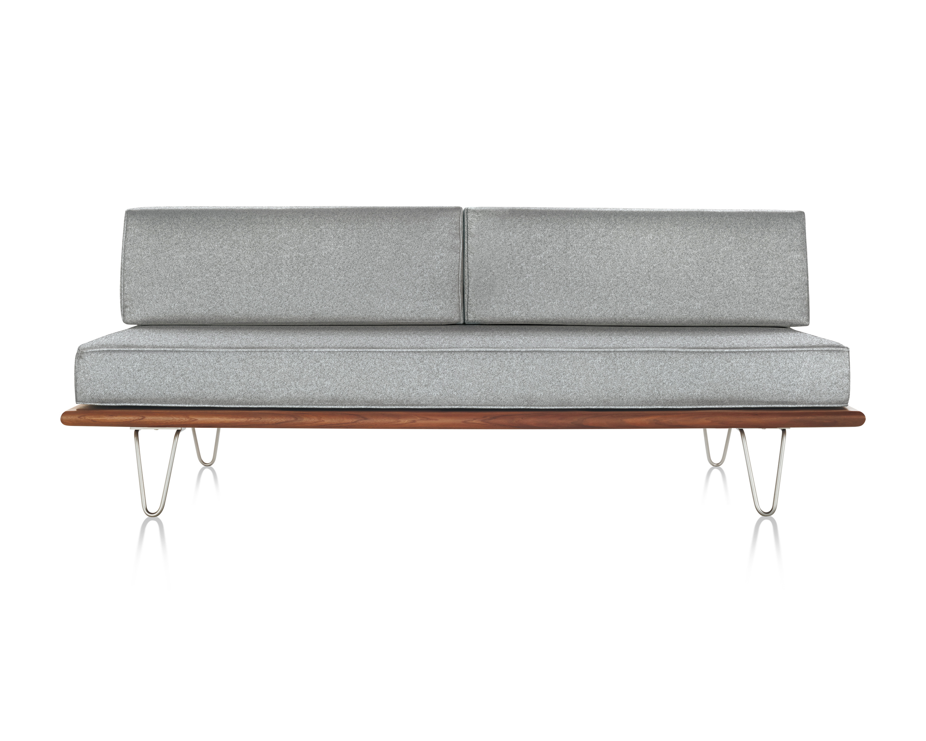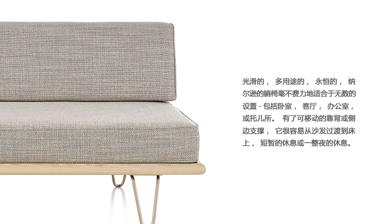 最初由乔治?纳尔逊(George Nelson)于1950年设计,重新发行时保留了原有的规格和精心制作的细节,比如木质平台的倾斜边缘和垫子的圆形焊缝管道,这是区别于仿制品的一个特征。不锈钢发夹腿或锥形木腿给它的经典纳尔逊触摸。缓冲增强了双密度泡沫,以更多的支持和耐久性,同时保持其轻质美学。随着住宅和公寓的面积不断缩小,纳尔逊牌(Nelson)躺椅等多功能家具为任何房间增添了一种实用而精致的感觉。