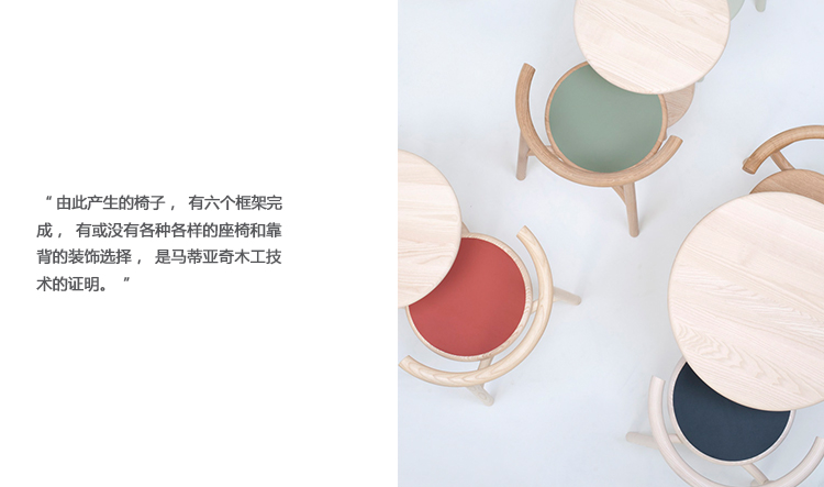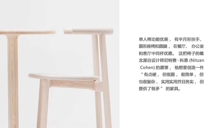 Solo Chair功能优美,半月形扶手、圆形座椅和圆形腿在餐厅、办公室和客厅中同样优雅。椅子的概念来源于设计师Nitzan Cohen的愿望,他想创造一件家具,“有点硬,但很圆,很简单,但也很复杂,实用并且务实,但提供了很多”。由此产生的椅子,可在各种框架完成,是马蒂亚齐的木工专业知识的证明。