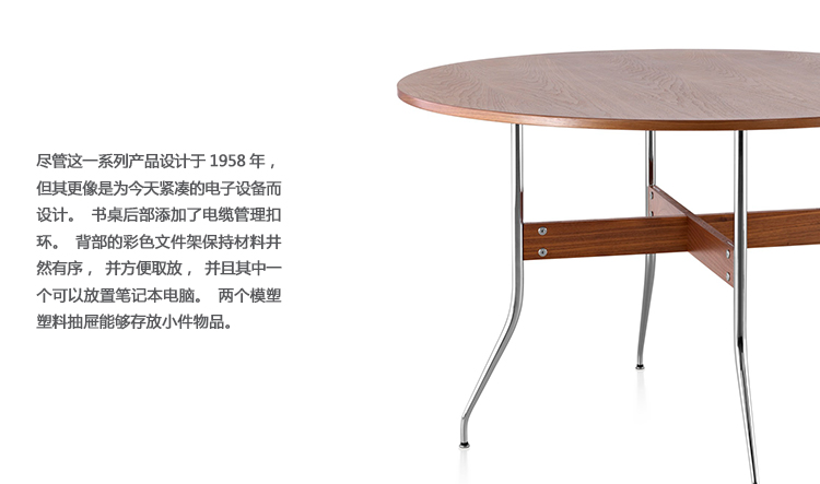 在George Nelson设计出Nelson swag leg系列产品50年后重新推出这款经典产品,主要是因为不管是其外观、尺寸还是功能都非常符合现代顾客的要求。这款办公桌的尺寸非常适合放置笔记本电脑或移动设备底座,并且能有效地利用您家里或办公室的空间。这一系列产品是办公室、会议室和饭厅的理想选择。