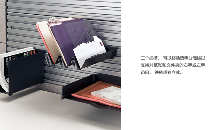 三个插槽。透明分隔器可以移动以支持对文件和文件夹的右手或左手使用。钢轨连接或独立的。