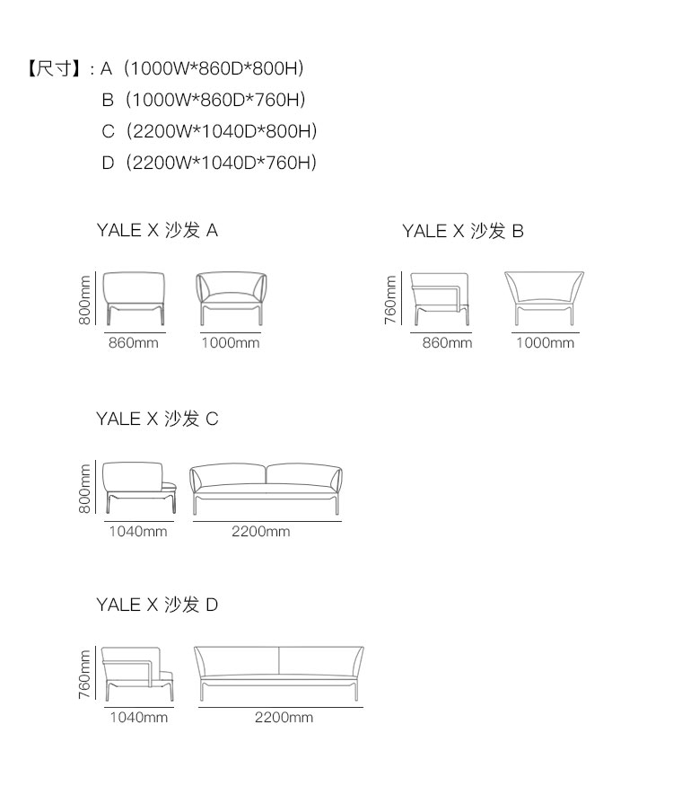 YALE X 沙发 系列尺寸/示意图