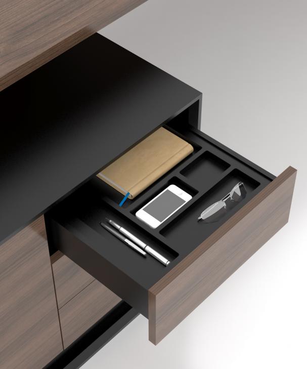 抽屉一触即开,采用按压式反弹导轨,内含文具盘.办公台 实景/空间展示