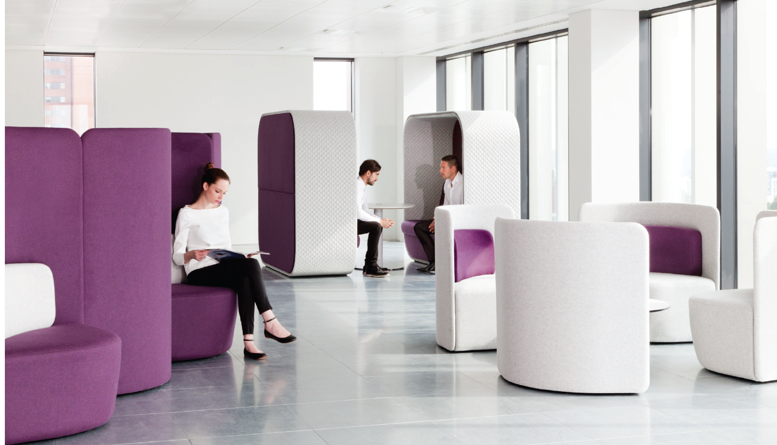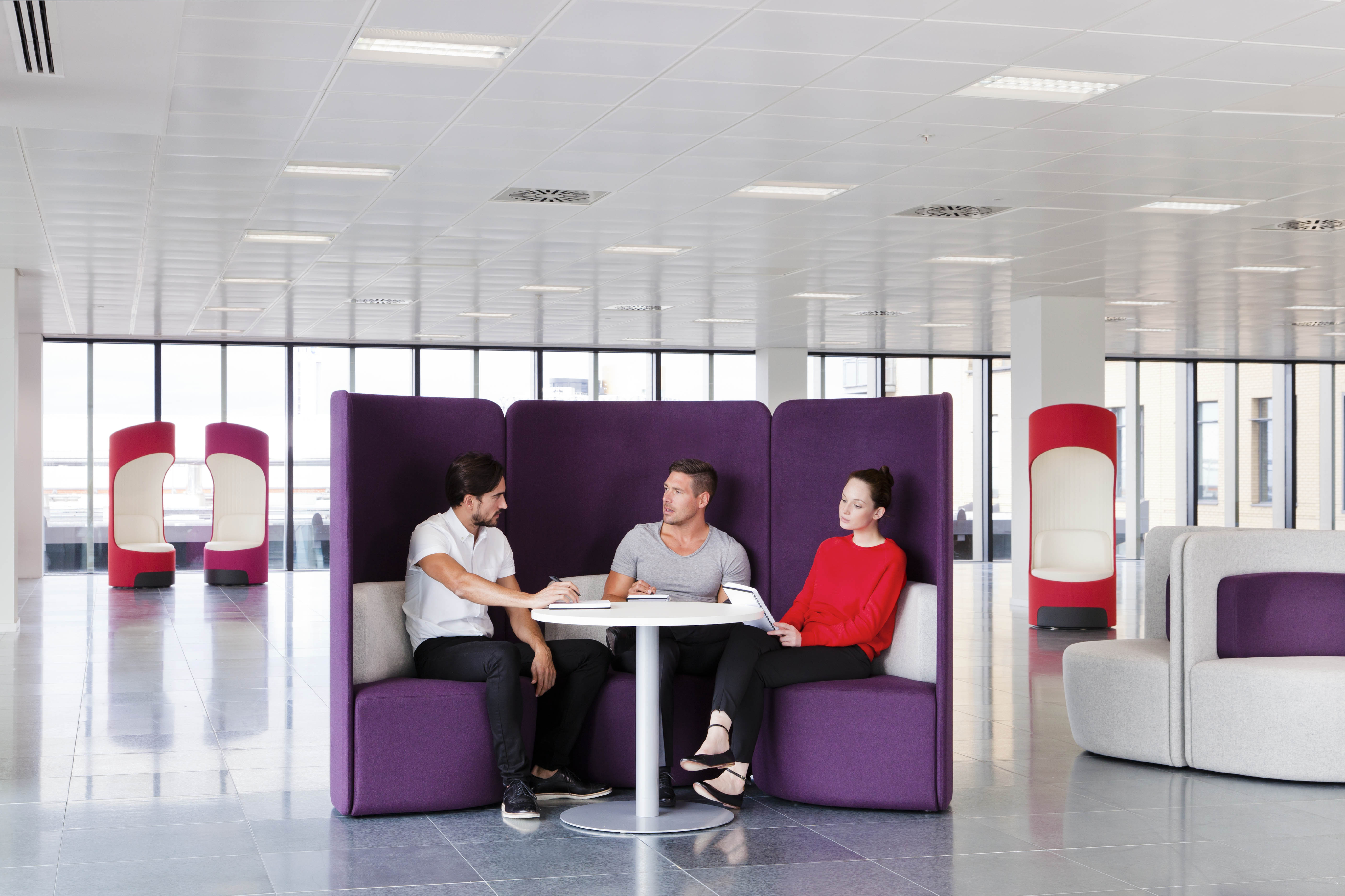 作为一种有高、低背两种款式可供选择的椅子,这种设计可以提高声学特性,并吸收周围背景噪音。