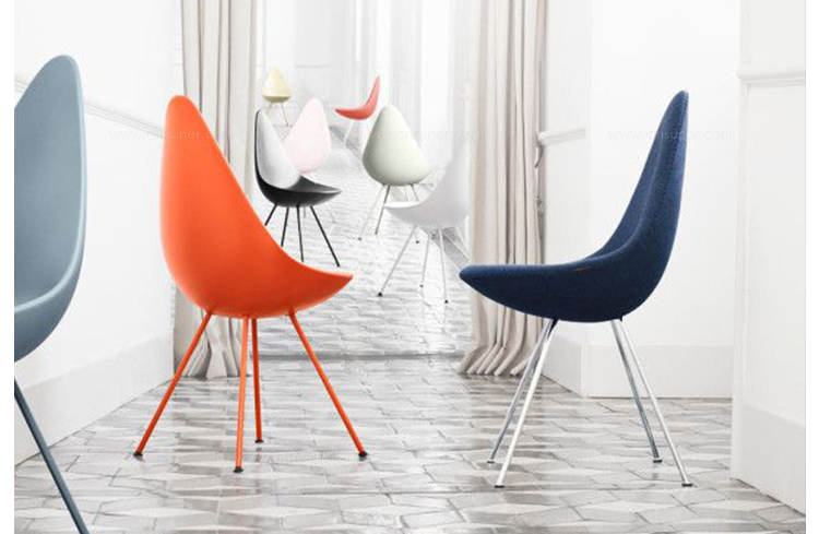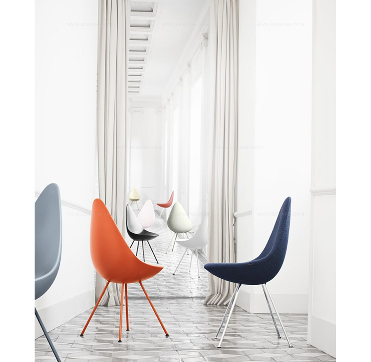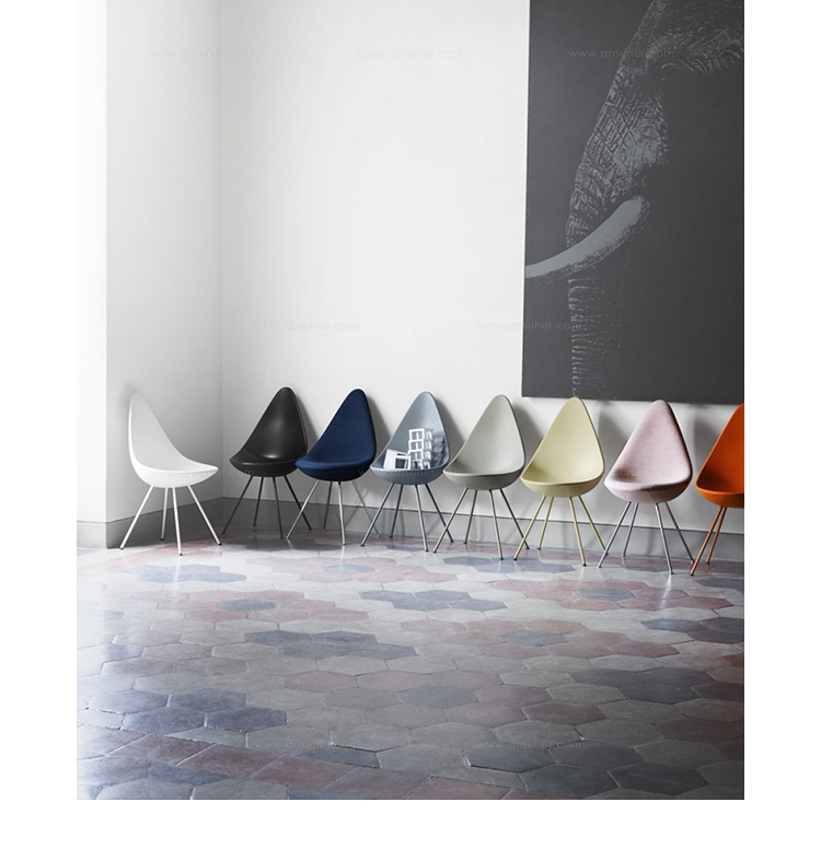 在“沉寂”50多年后,椅子现在重新上市。这把小椅子有着非常大的个性,清新并充满活力,稀有的传承。背面的设计结合了一个温暖的拥抱和自由运动,从而产生一个令人惊讶的舒适度。阿恩·雅各布森是非常富有成效的建筑师和设计师。他与弗里茨·汉森的合作可以追溯到1934年。1952年,“蚂蚁”和“系列7”椅子产生,从而将雅各布森和弗里茨·汉森的名字载入到家具的历史。1950年代末,阿恩·雅各布森设计了哥本哈根皇家酒店,并把蛋,天鹅,天鹅沙发和3300系列沙发带到设计世界。阿恩·雅各布森曾经并将永远是一名令人欣赏和杰出的设计师。他的家具和其他设计工作已经成为国内外遗产。“水滴椅”塑料椅子有四条不锈钢腿,镀铬或粉饰,以便与外套匹配。塑料外套提供一系列颜色,并提供与之颜色相匹配的羊毛垫块。"