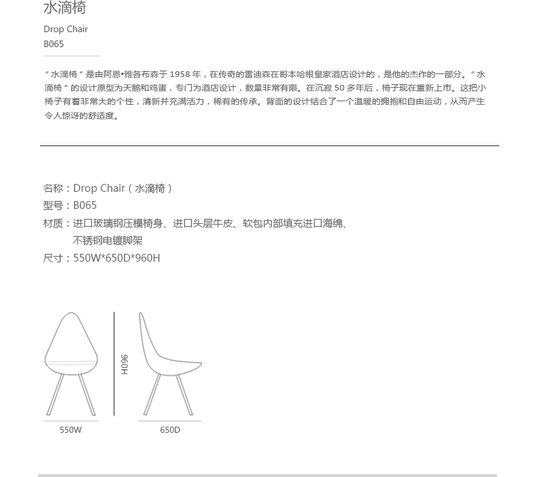 "“水滴椅”是由阿恩·雅各布森于1958年,在传奇的雷迪森在哥本哈根皇家酒店设计的,是他的杰作的一部分。“水滴椅”的设计原型为天鹅和鸡蛋,专门为酒店设计,数量非常有限。