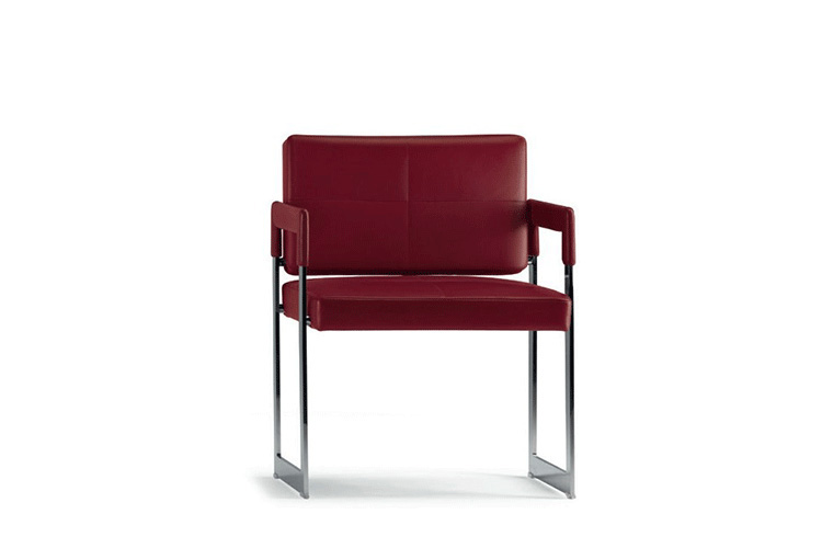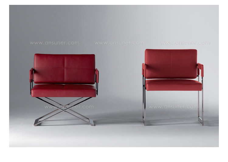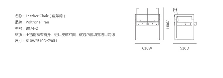 "Leather皮革椅系列家具线条干净简明,“X”交叉造型或者“H”造型脚架支撑着坐垫,新颖独特,由Jean-Marie Massaud设计。它采用外露的金属架,有三种不同的做工,座椅为聚氨酯泡沫材料,靠背较低,坐垫宽敞。有两种面料可供选择:天然皮革和纺织面料。两种款式都有皮革和染色纺织面料的扶手和同款的靠枕。沙发椅的造型形式严谨,它的特点和个性特征与Poltrona Frau现代室内家居的设计非常统一协调。