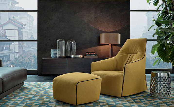 "The Santa Monica Lounge armchair,characterized by a unique design,is a project conceived by the French designer Jean-Marie Massaud,and it is produced by Poliform,a leading company in the made in Italy furniture manufacture.The Santa Monica Lounge armchair on sale in our showroom is matched with the Santa Monica ottoman.Both the items are covered in fabric,yellow colour,with iron coloured stitches."