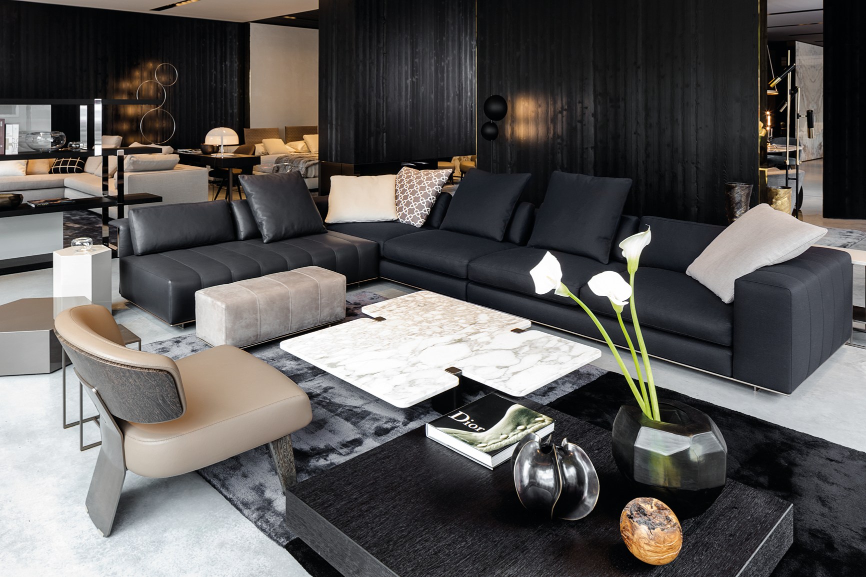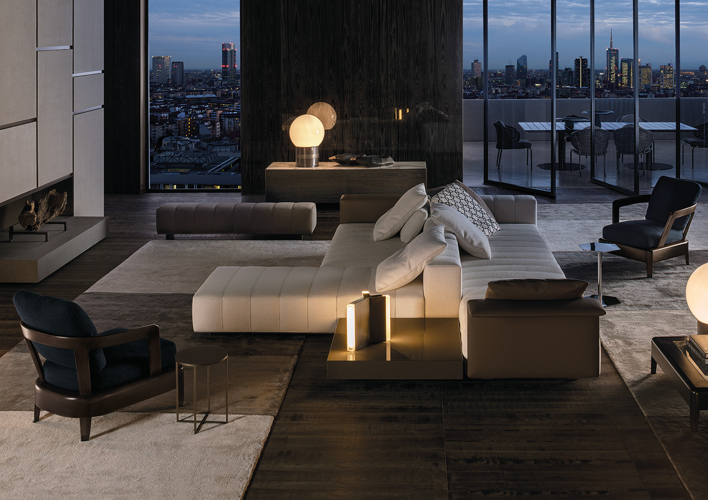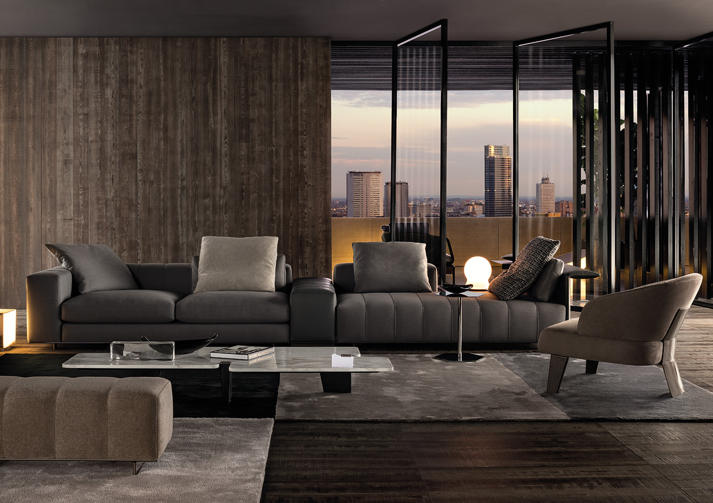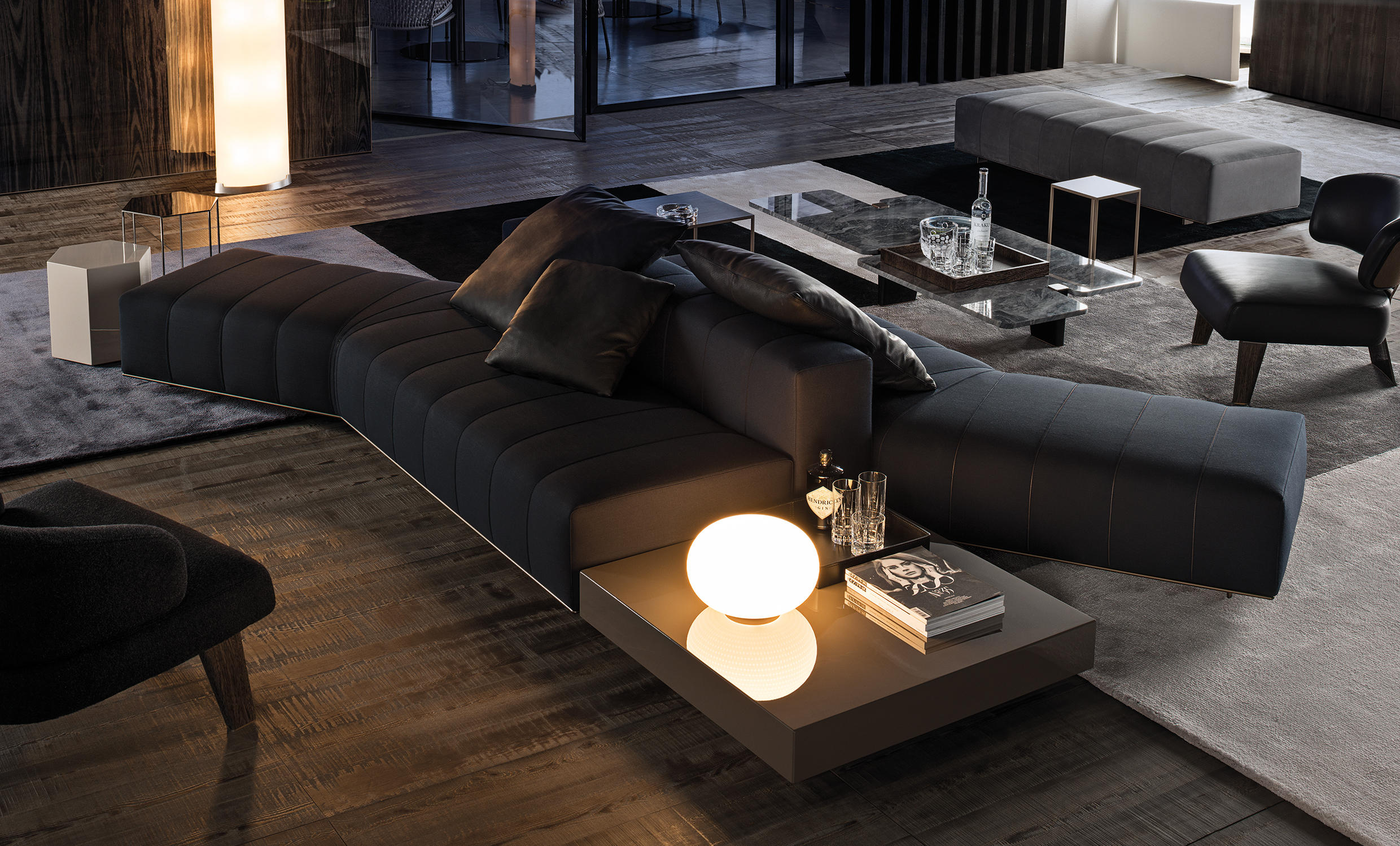 弗里曼“裁缝”项目的理念和原创性在其衍生系列弗里曼“休息室”中也有所体现。弗里曼“休息室”沙发纵深度有所降低,不仅更易搭配较小的居住空间,还可以用在接待场所,如等候室、前台区域、行政办公室。单组沙发的特点在于采用规则图形纹样的优雅缝线设计,可以自由随性地组合沙发,打造灵动的造型。“Wing”扶手拥有轻盈的线条,这要得益于采用聚氨酯为基材的泡沫金属框架。精致的包覆材料展现出公司运用复杂面料进行剪裁加工的实力。皮革和织物面料的各个部件通过浅铜色人造皮革束带和双缝线工艺连接在一起,打造出独特的纵深效果。