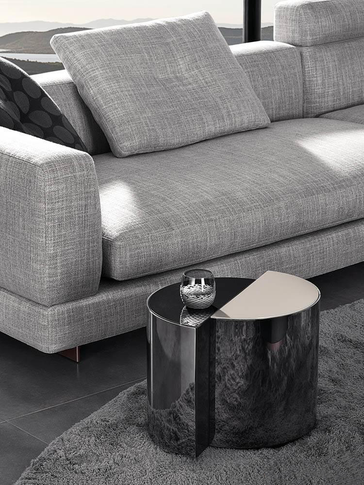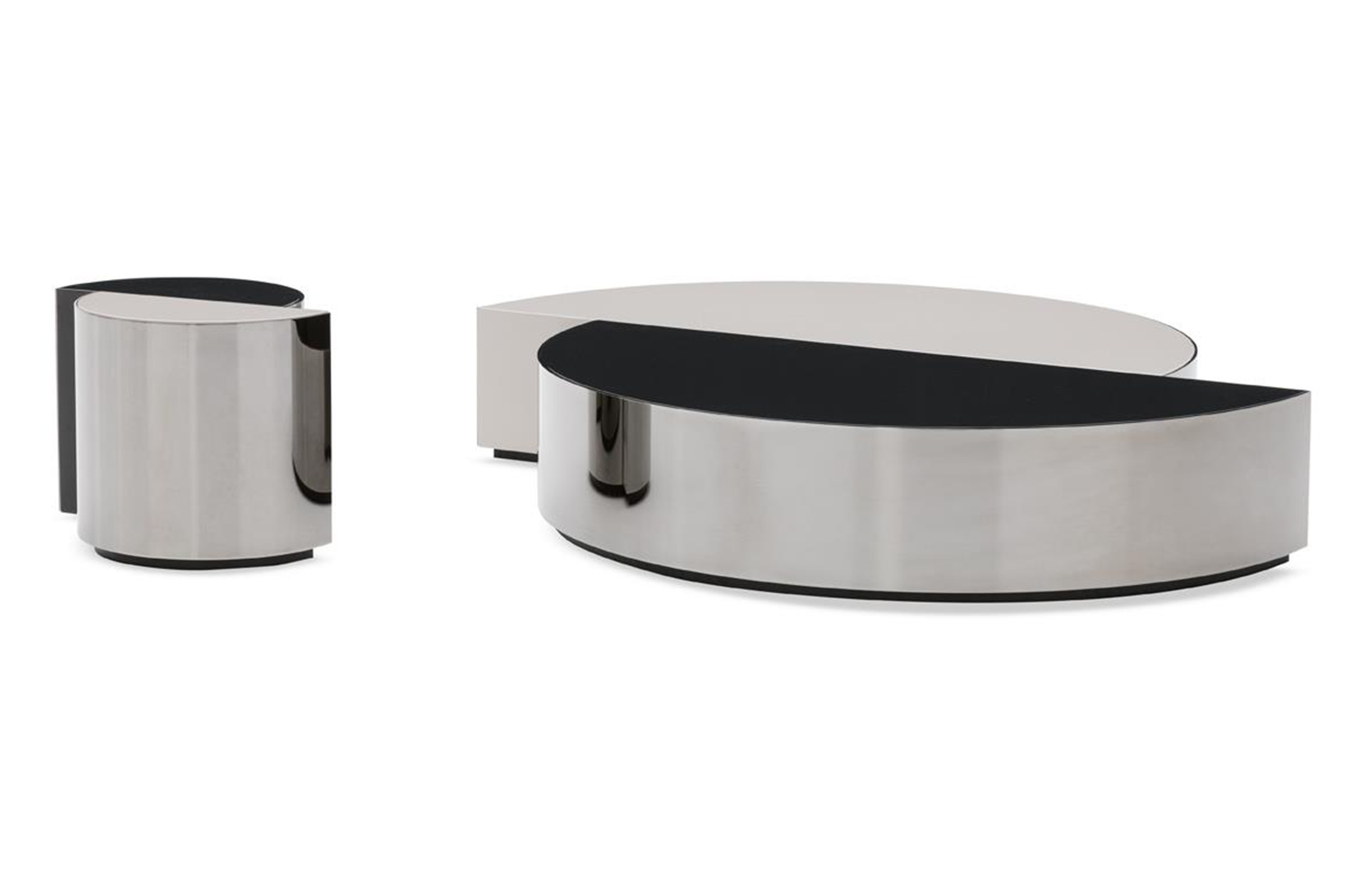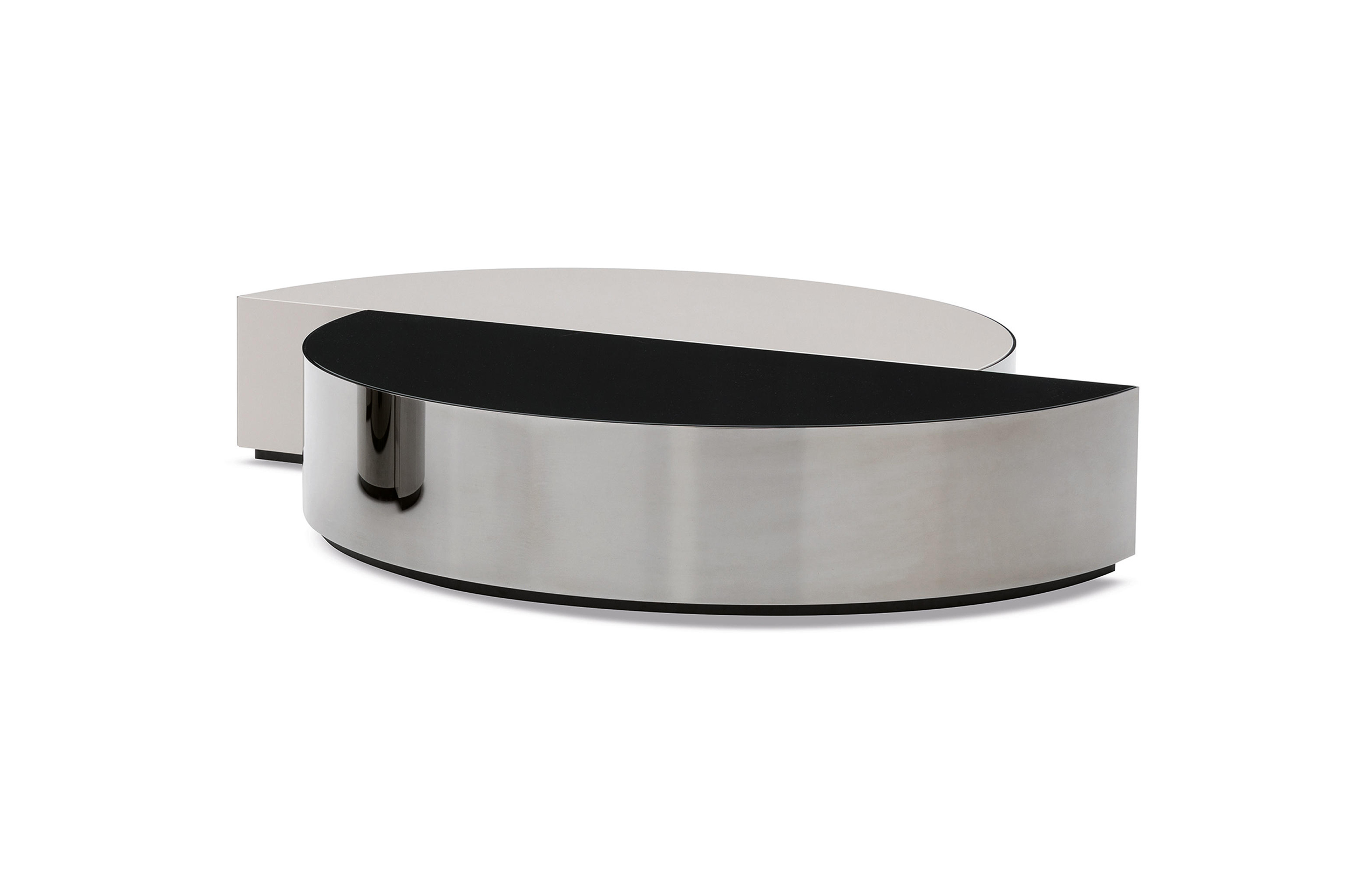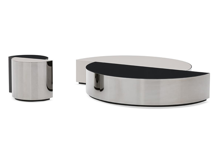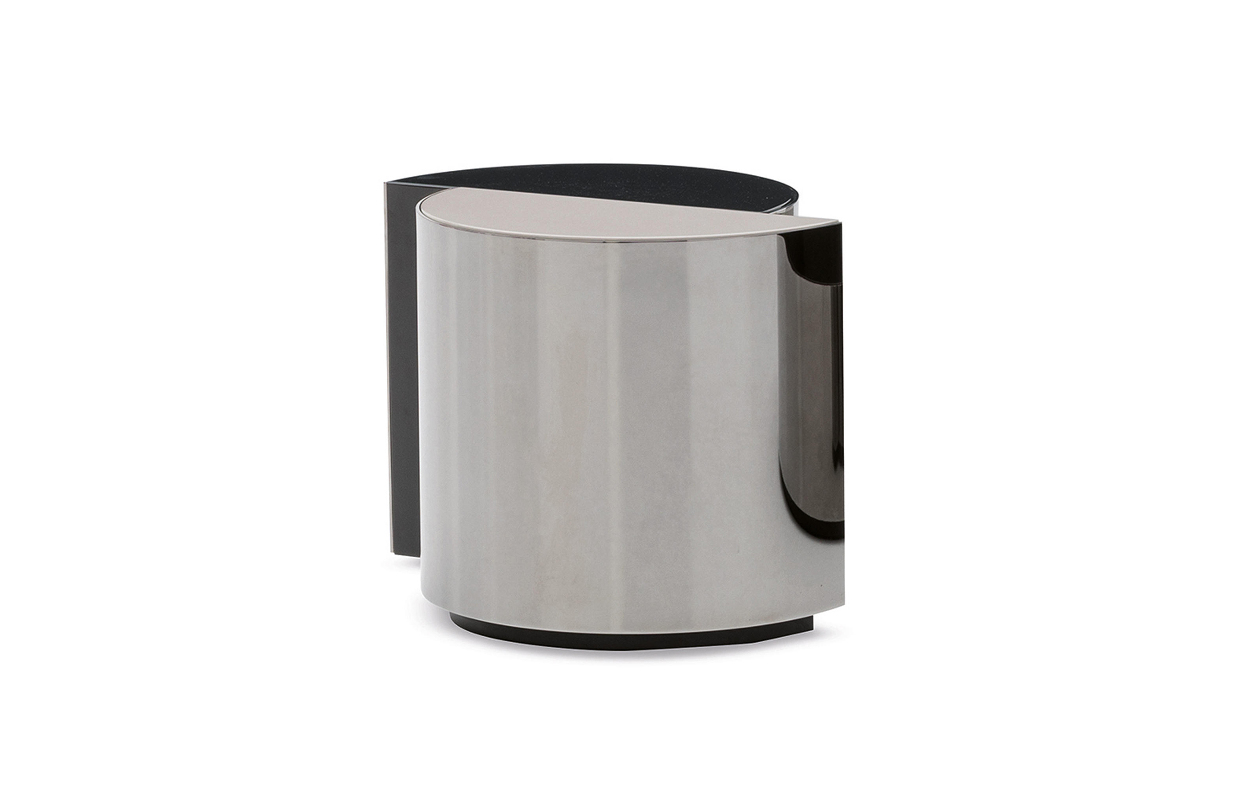 盾牌桌子上有一个强烈的雕塑印记,让人想起70年代的当代雕塑。它被设计成一个几何体积,圆柱体的形状被分成两个偏置的部分,并用一个带有黑色镍涂层的弧形钢板的屏蔽来补充。