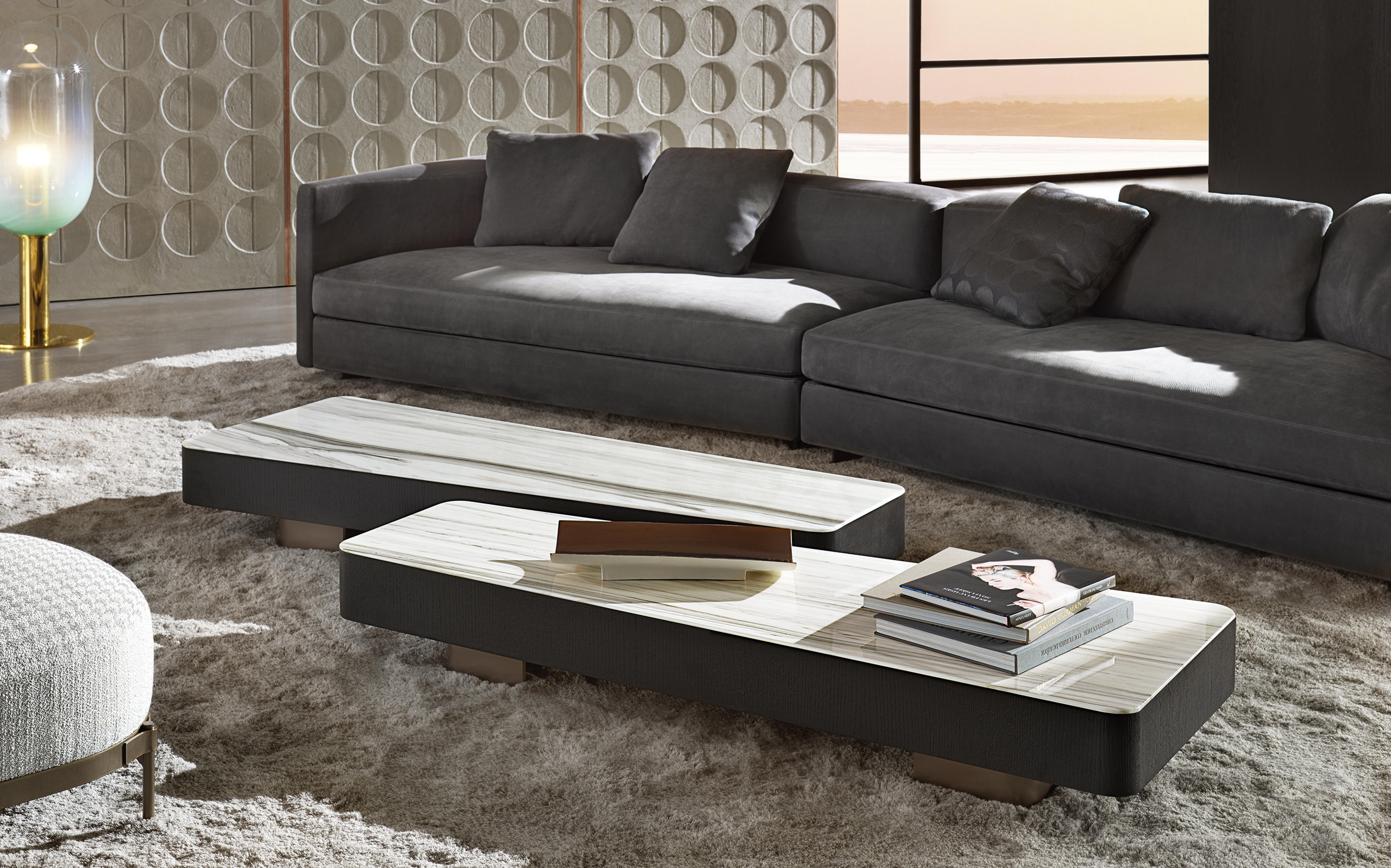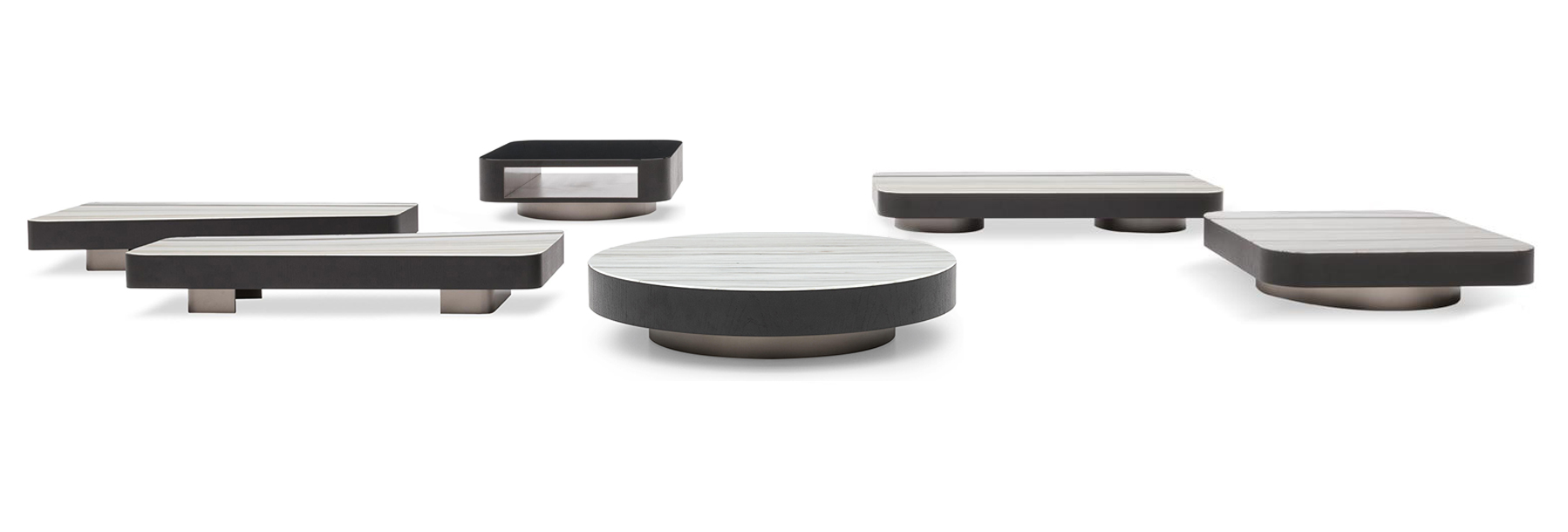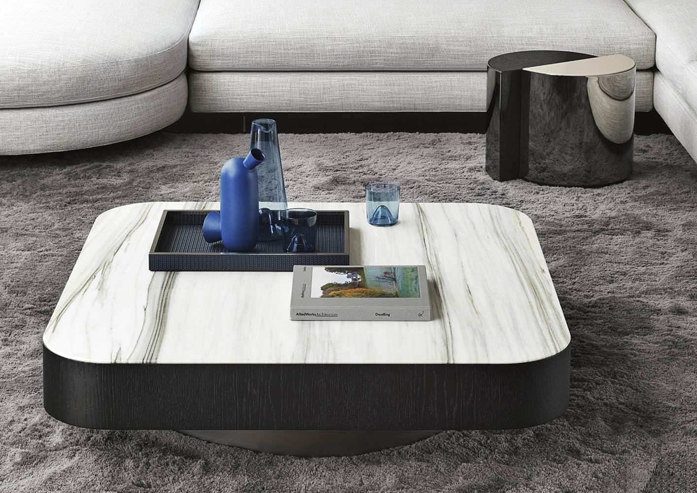 由悬挂的几何体积和较低的高度相结合形成的,在圆形、方形、矩形和梯形的版本中都有米尔顿的侧表。这些几何图形被圆角的圆角所软化,这让人想起了亚历山大“下降”座位系统的蜿蜒曲线。它们的特点是对70年代的线条进行了更为现代和装饰性的重新诠释,展示了珍贵材料和有机几何的完美结合。