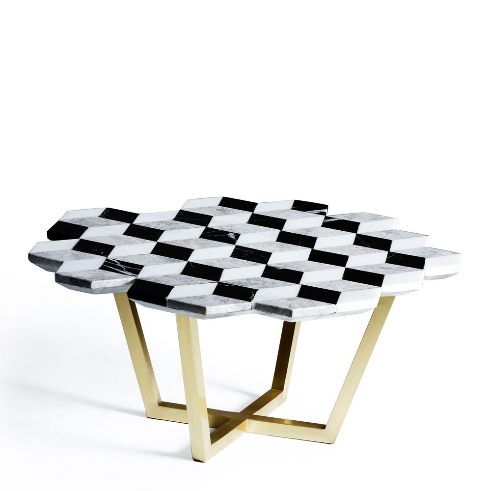 复视咖啡桌(Diplopia coffee table)是从创建一个传达视觉错觉的物体的想法中构思出来的。通过组合不同种类的大理岩产生立体效应。大理石桌面的不对称形式增加了复视的幻觉。复色的单色和彩色版本是用抛光或未抛光的铜腿制成的。更大的尺寸可根据要求提供。