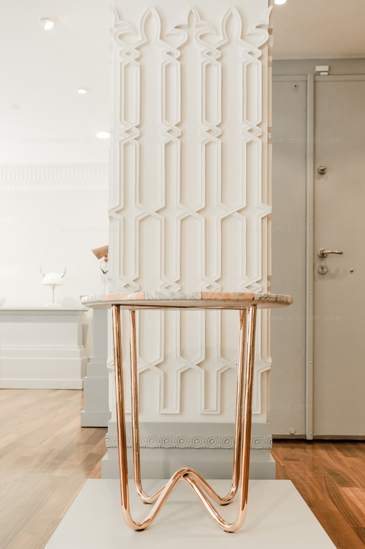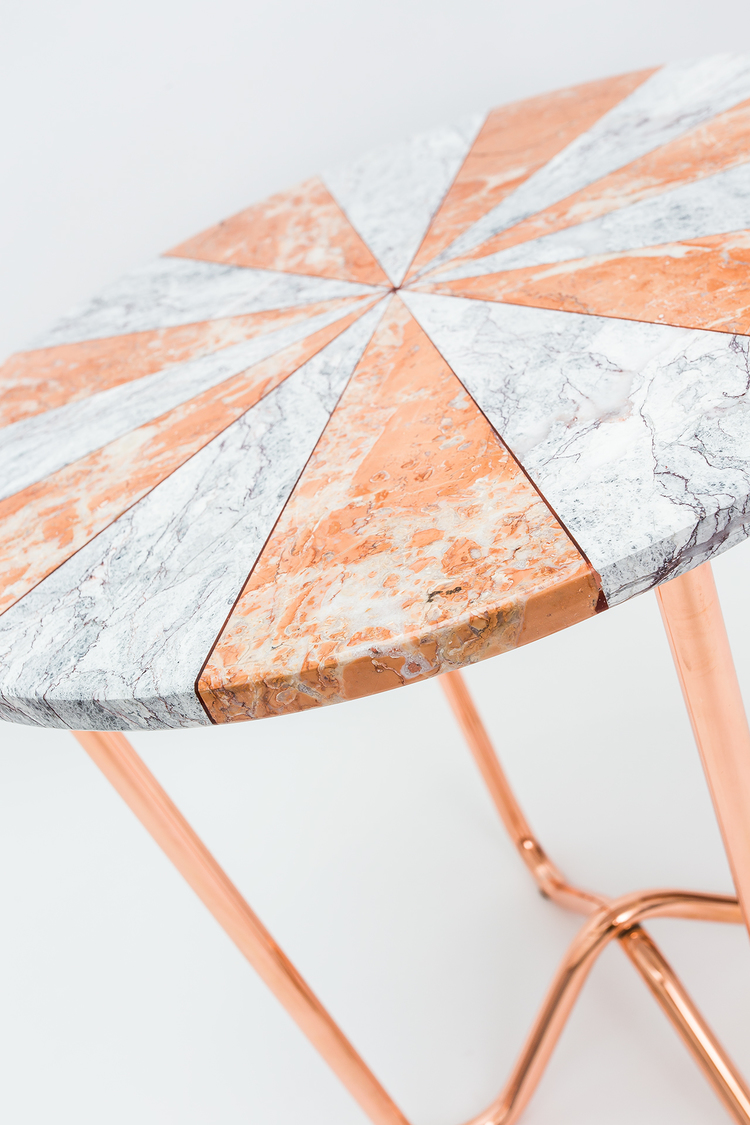 “Jasmine Pizza(茉莉花披萨)”结合了两种不同的大理石和对比鲜明的色彩,完全是手工制作,饰有弧形形铜腿。 “Jasmine Pizza”有不同的大理石,腿部饰面和尺码。