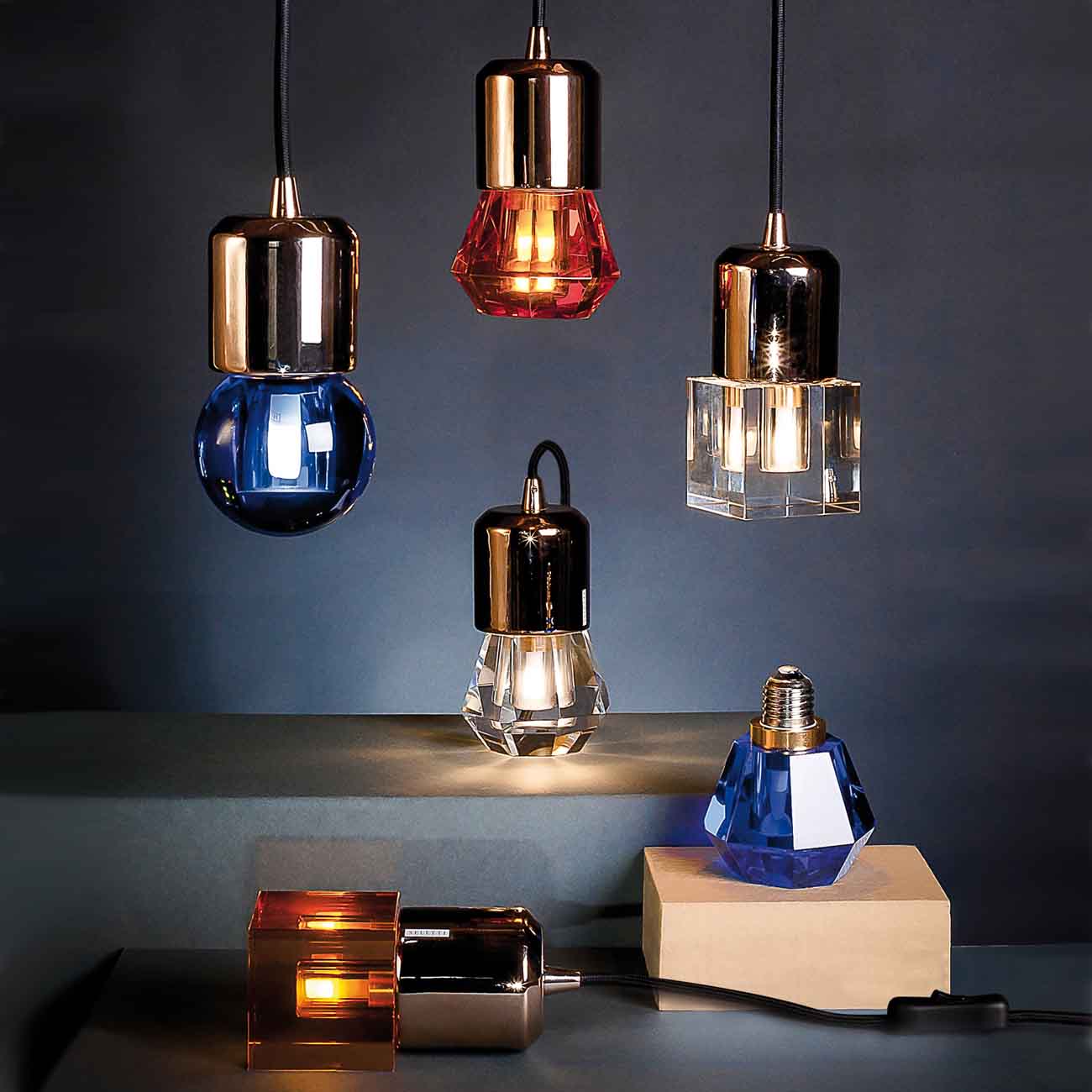 一个新的灯泡概念,在水晶,技术和复杂的透明度之间的对话,经过刻面手工处理.灯泡被重新解读为闪闪发光的宝石,三款灯泡由三种不同水晶形状和三种颜色组成.