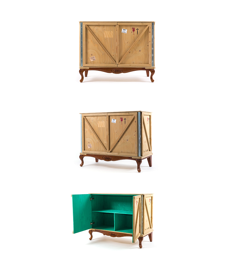 Designed by Marcantonio Raimondi Malerba for Seletti, this modern bedside table blends two different styles in one quirky design. A packing case boasting various labels and signs is paired with ornate Louis XIV legs. The bright green interior features one shelf and two storage spaces. Handmade from solid wood, this Export Como Bedside Table is as impressive in its durability as it is in its distinctive design. It can be used on its own to create a focal point in a bedroom or alongside other pieces of furniture from the Export Como collection. Made in Italy.