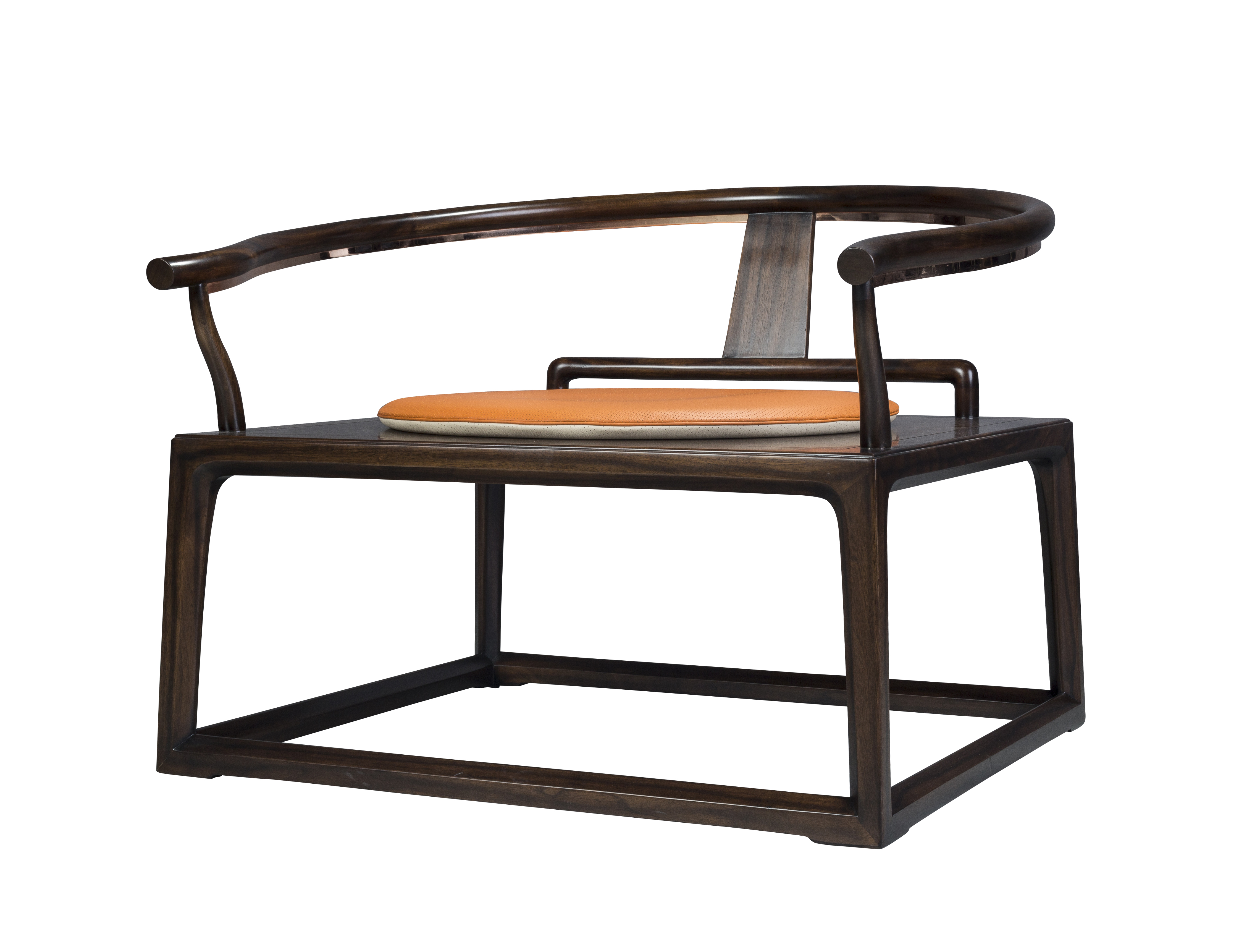 1.源于中式传统圈椅家具造型,以线为主,儒雅灵秀。 2.靠背板采用光素手法,精巧简洁,通透灵动。 3.坐面宽大,禅椅形制,可供盘腿而坐。 4.前侧脚踏装饰铜条,牢固耐磨,质感强。