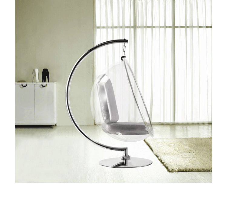 "芬兰家具设计大师艾洛.阿尼奥(Eero Aarnio)在德国品牌Adelta的代表作Bubble Chair(泡泡椅)。灵感来自于Ball Chair,但尺寸略小,而且椅子是以压克力制成,光线可以从四面八方透进。压克力加热充气,使它成为皂泡状,加入一个钢圈和椅垫即成。这样一组貌似轻巧的家具,但却能负重至少200公斤以上,由天花板垂链将Bubble吊起,宛如漂浮于空气中的泡泡一般!洁净面透明!带着科技感的椅子,又像置身于太空中,未来感十足。摆脱了椅子就是要放在地板上的刻板印象。最适合为摄影背景之用。坐在这把椅子上,即使身处一个拥挤的空间,也有点遗世独立的奇妙感觉。挪威一家电话公司在总公司入口大厅吊了几把这样的椅子,让客户可以在打行动电话时,有个宁静的空间。这件作品在1966年的科隆家具博览会上一举成名。