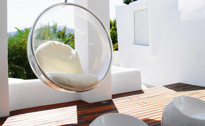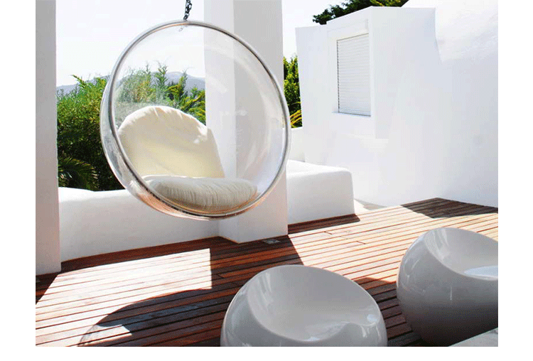 "芬兰家具设计大师艾洛.阿尼奥(Eero Aarnio)在德国品牌Adelta的代表作Bubble Chair(泡泡椅)。灵感来自于Ball Chair,但尺寸略小,而且椅子是以压克力制成,光线可以从四面八方透进。压克力加热充气,使它成为皂泡状,加入一个钢圈和椅垫即成。这样一组貌似轻巧的家具,但却能负重至少200公斤以上,由天花板垂链将Bubble吊起,宛如漂浮于空气中的泡泡一般!洁净面透明!带着科技感的椅子,又像置身于太空中,未来感十足。摆脱了椅子就是要放在地板上的刻板印象。最适合为摄影背景之用。坐在这把椅子上,即使身处一个拥挤的空间,也有点遗世独立的奇妙感觉。挪威一家电话公司在总公司入口大厅吊了几把这样的椅子,让客户可以在打行动电话时,有个宁静的空间。这件作品在1966年的科隆家具博览会上一举成名。