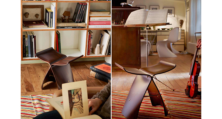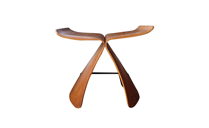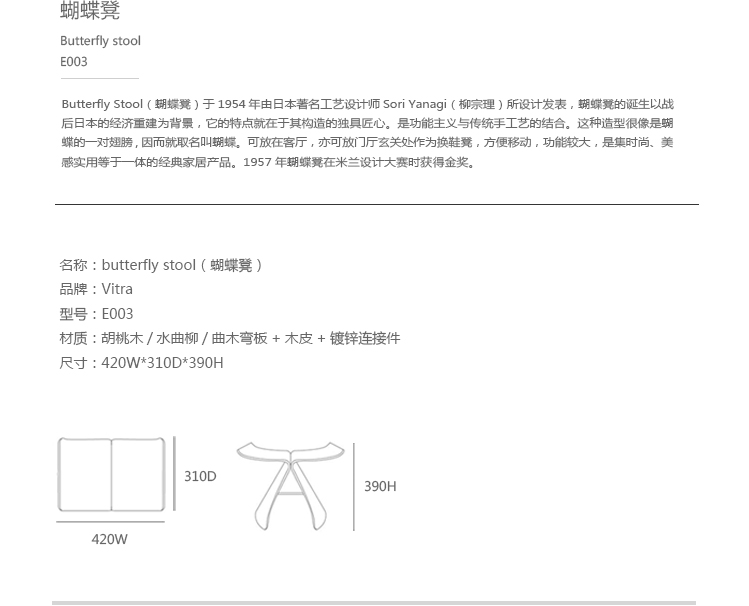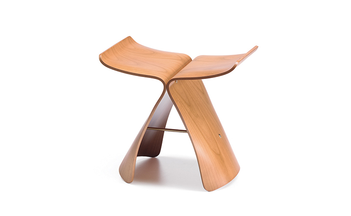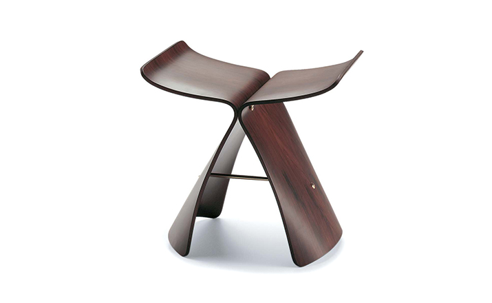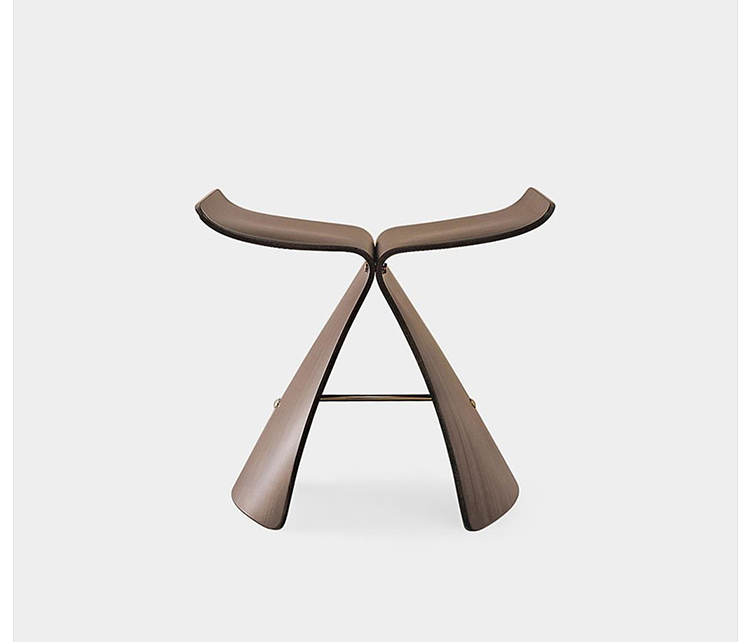 Butterfly Stool(蝴蝶凳)于1954 年由日本著名工艺设计师Sori Yanagi(柳宗理)所设计发表,蝴蝶凳的诞生以战后日本的经济重建为背景,它的特点就在于其构造的独具匠心:开头完全相同的两个部分通过一个轴心对称地连接在一起,连接处在座位下用螺丝和铜棒固定。是功能主义与传统手工艺的结合。这种造型很像是蝴蝶的一对翅膀,因而就取名叫蝴蝶。可放在客厅,易可放门厅玄关处做为换鞋凳,方便移动,功能强大,是集时尚、美感、实用等于一体的经典家居产品。1957年蝴蝶凳在米兰设计大赛时获得金奖。