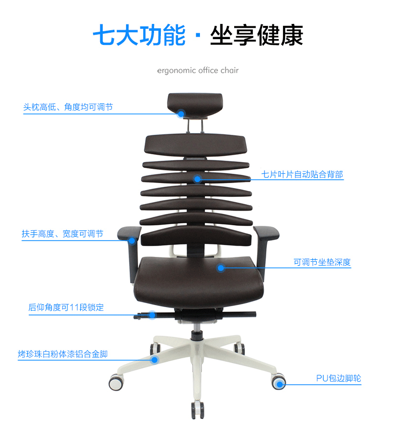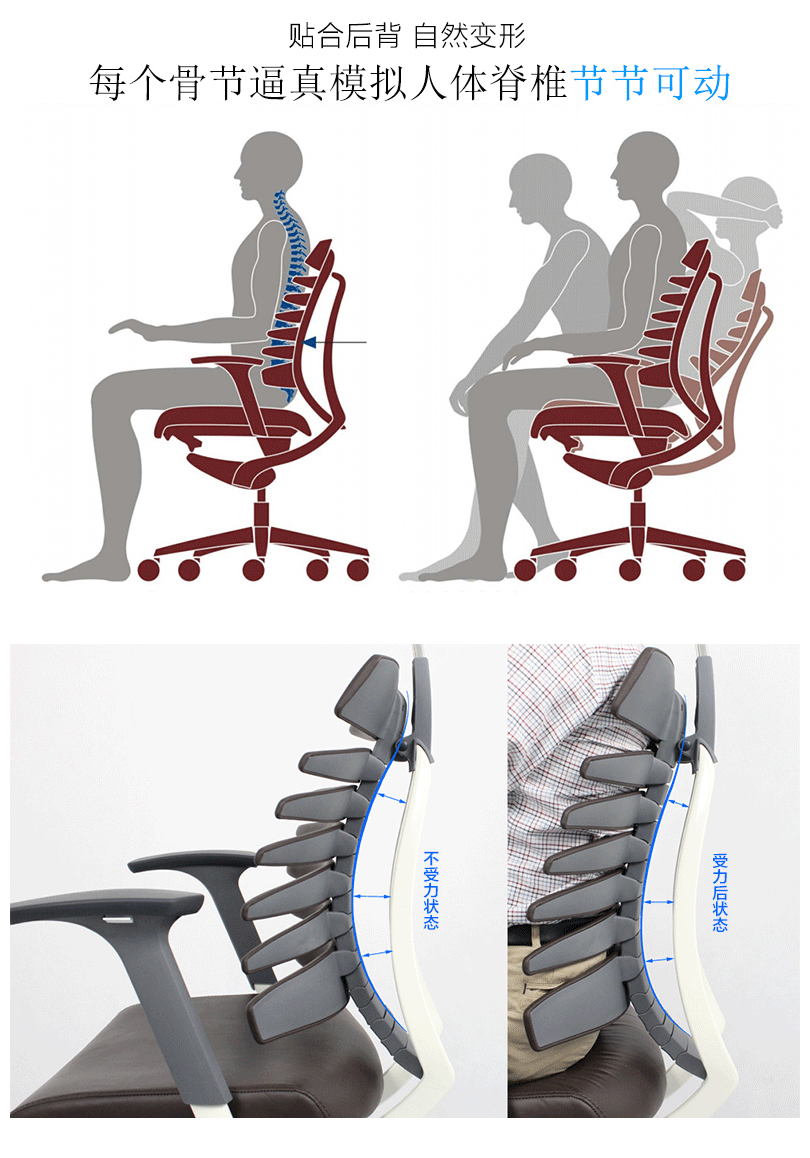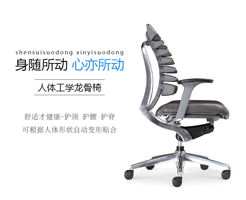 龙骨椅模拟人体脊椎骨造型及特点,并运用贴合返回技术,使座椅自动贴合背部。龙骨椅是一款符合人体工学的全功能性办公椅,力求使用者能充分理解其人性化的设计及达到最舒适的调节。