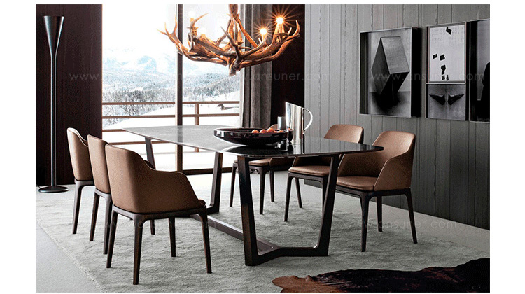 由Emmanuel Gallina设计的Concorde Table(协和式飞机桌)风格简约,通过简单的形式充分发挥了木料的自然特征。朴素优雅是Concorde长桌的独特之处,也是设计师的风格表现。长桌采用横纹核桃木和施佩萨特橡木,桌面有四种抛光和三种磨光大理石可供选择。
