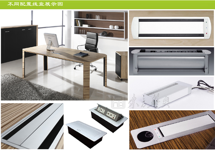 ※ 班台的过线系统介绍:此款班台可以选择如图的手动线盒、电动线盒、以及毛刷翻盖线盒,适合你不同的办公需要,内部可配置动功能三插电源孔、网络接口、耳机音频接口、话筒接口、VGA接口,也可根据客户实际需要选择和定做。