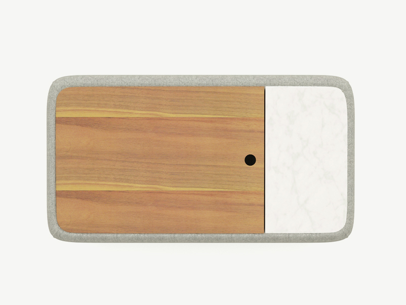 Etna coffee table carry on the spirit of the sofas completing the composition with an elegant piece that display armonius proportions and material balance with the use of solid wood feet, so upholstery, marble fix top and plywood lid on top of a storage for daily use.