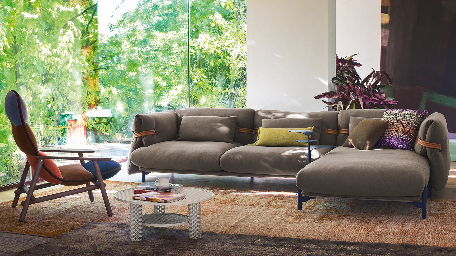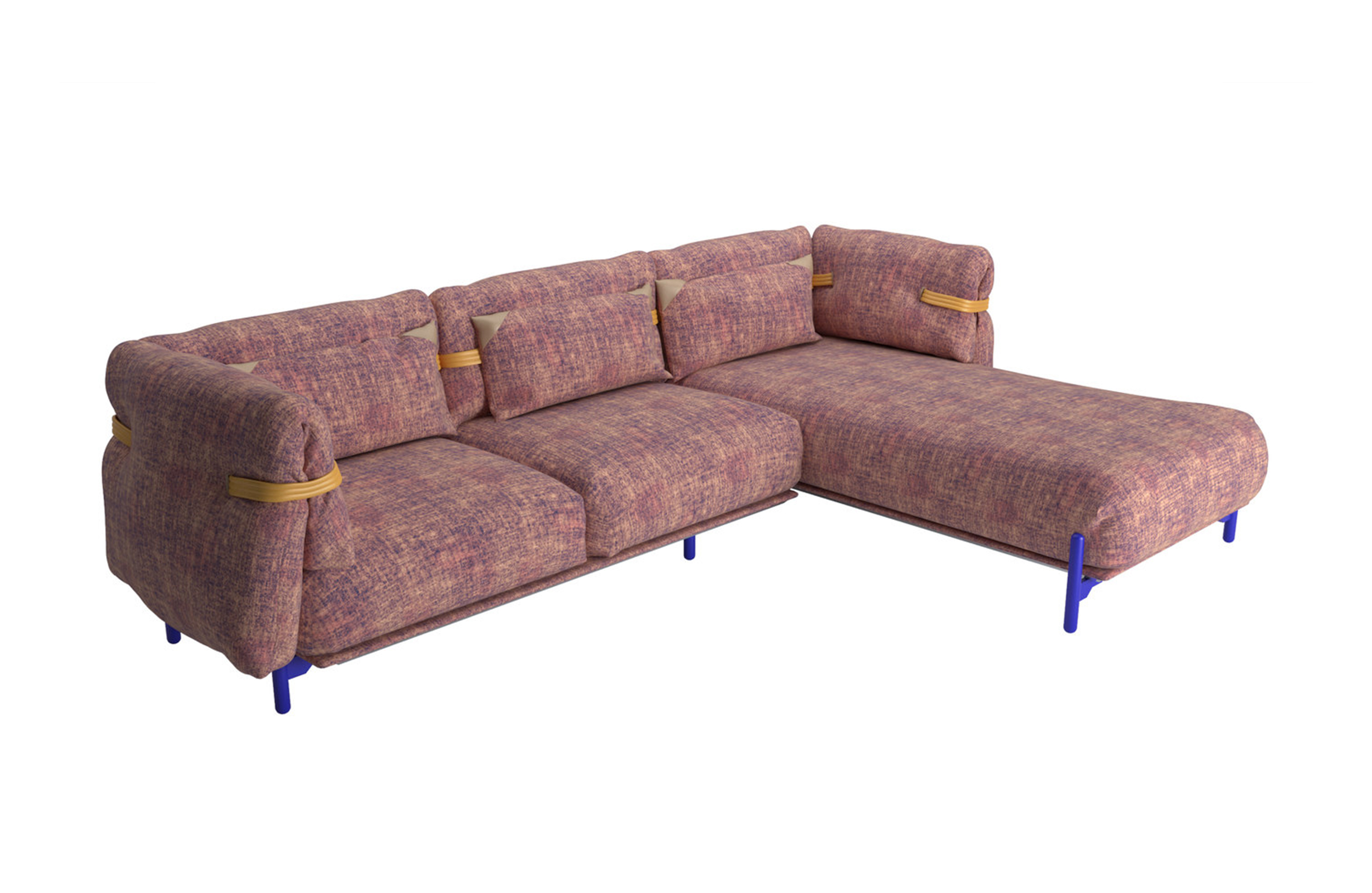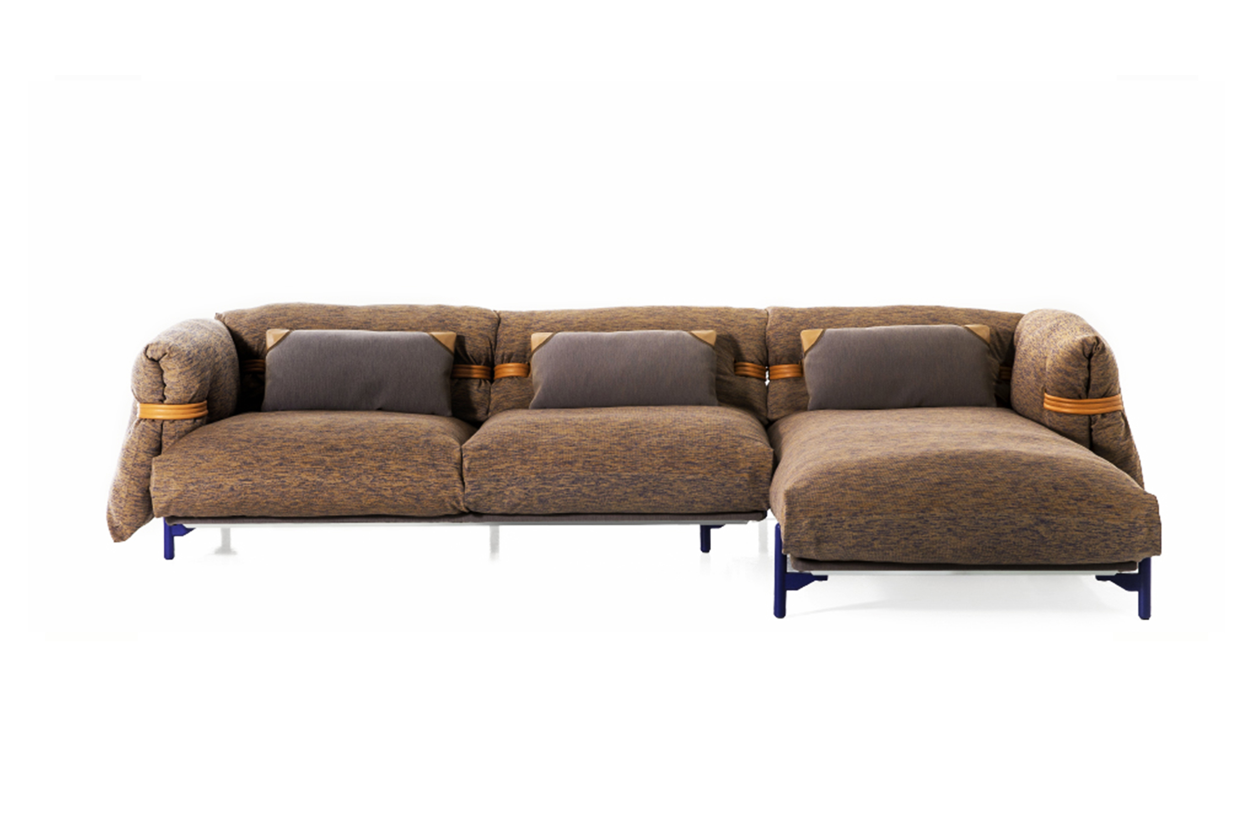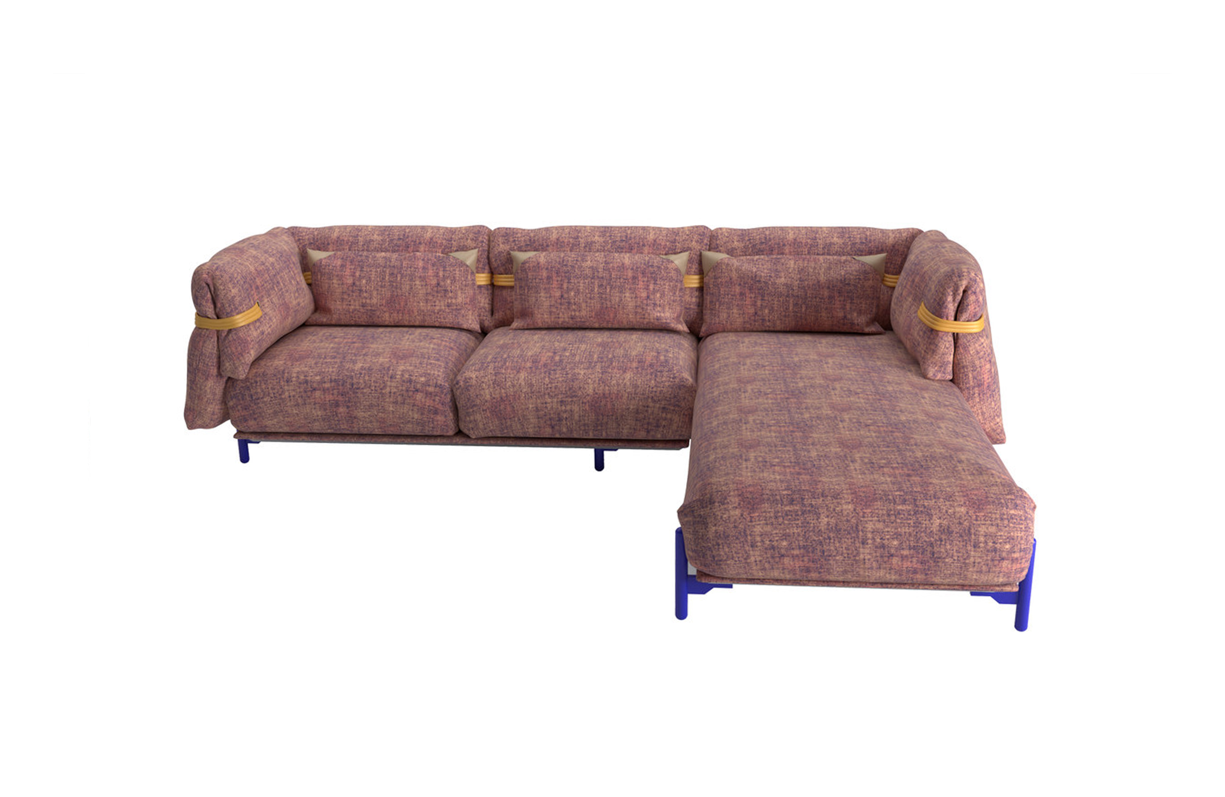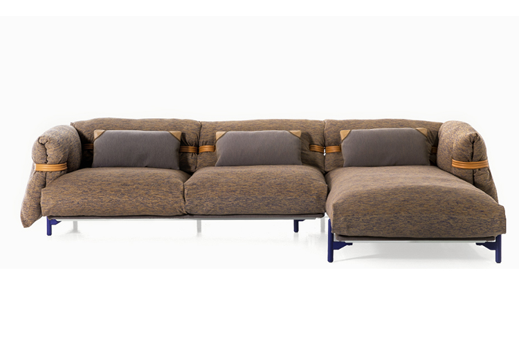 舒适和柔软高于一切。一个开源的沙发,一个喜欢舒适的座椅的设计选择,它试图看起来和感觉比以往更柔软和舒适。它的结构被圈在编织的腰带里与柔软的坐垫交织在一起,使其完全放松。折叠的覆盖层强调了无忧无虑、没有定义的形状,进一步强调了用针织物来固定它的位置。一个具有不寻常的结构的破坏式沙发:铝框架可以自由组合,组合不同的组件,一起工作,提供各种和谐的定制。