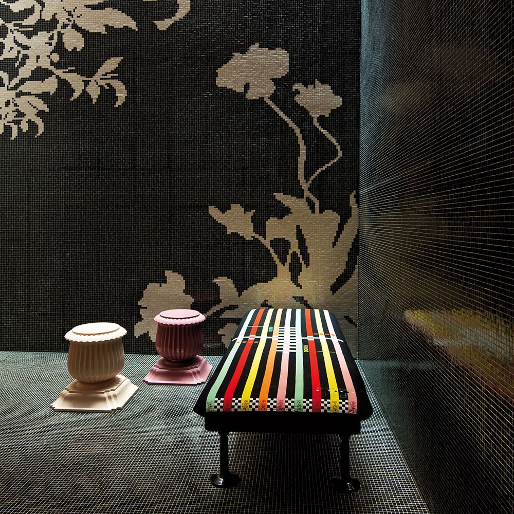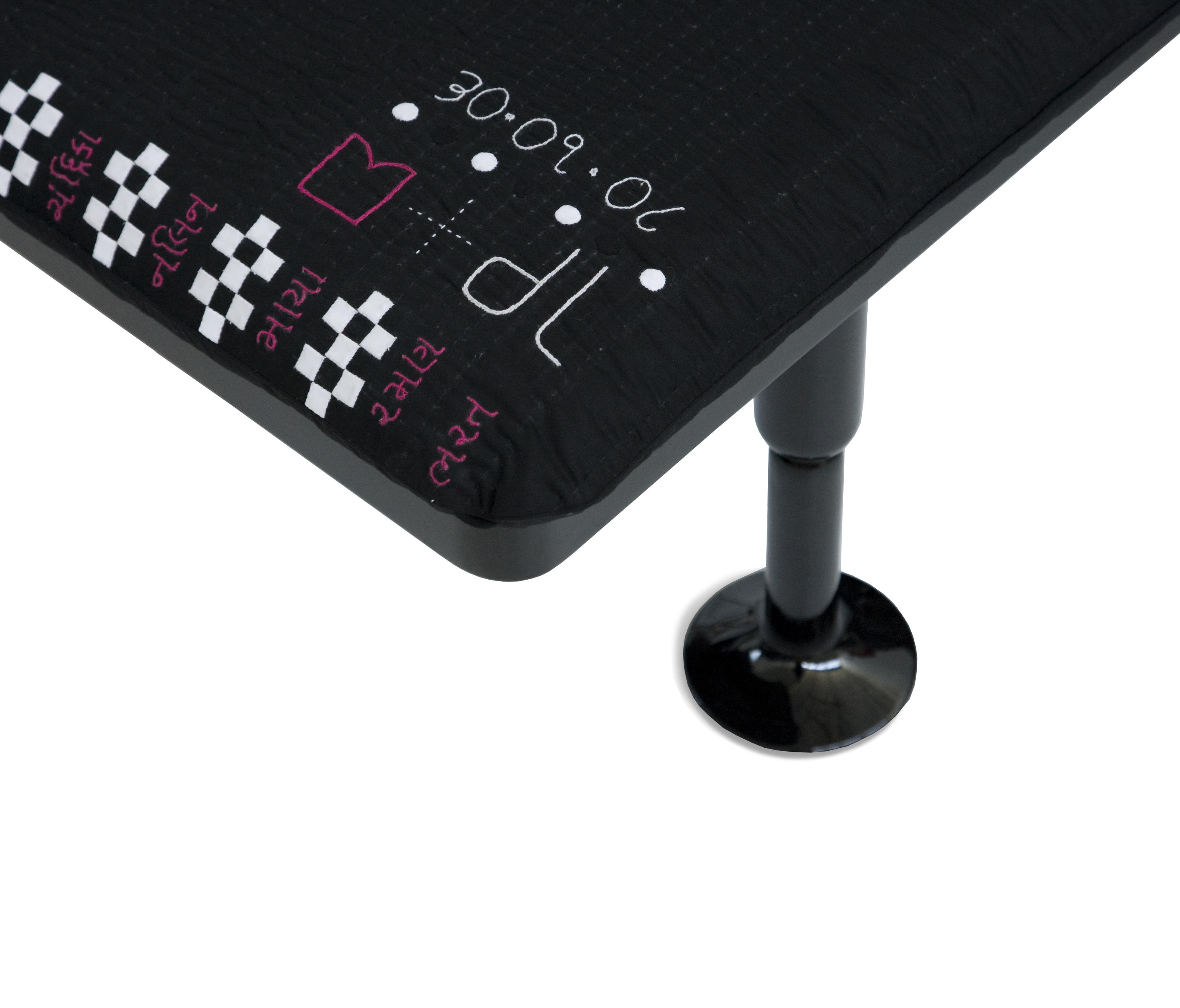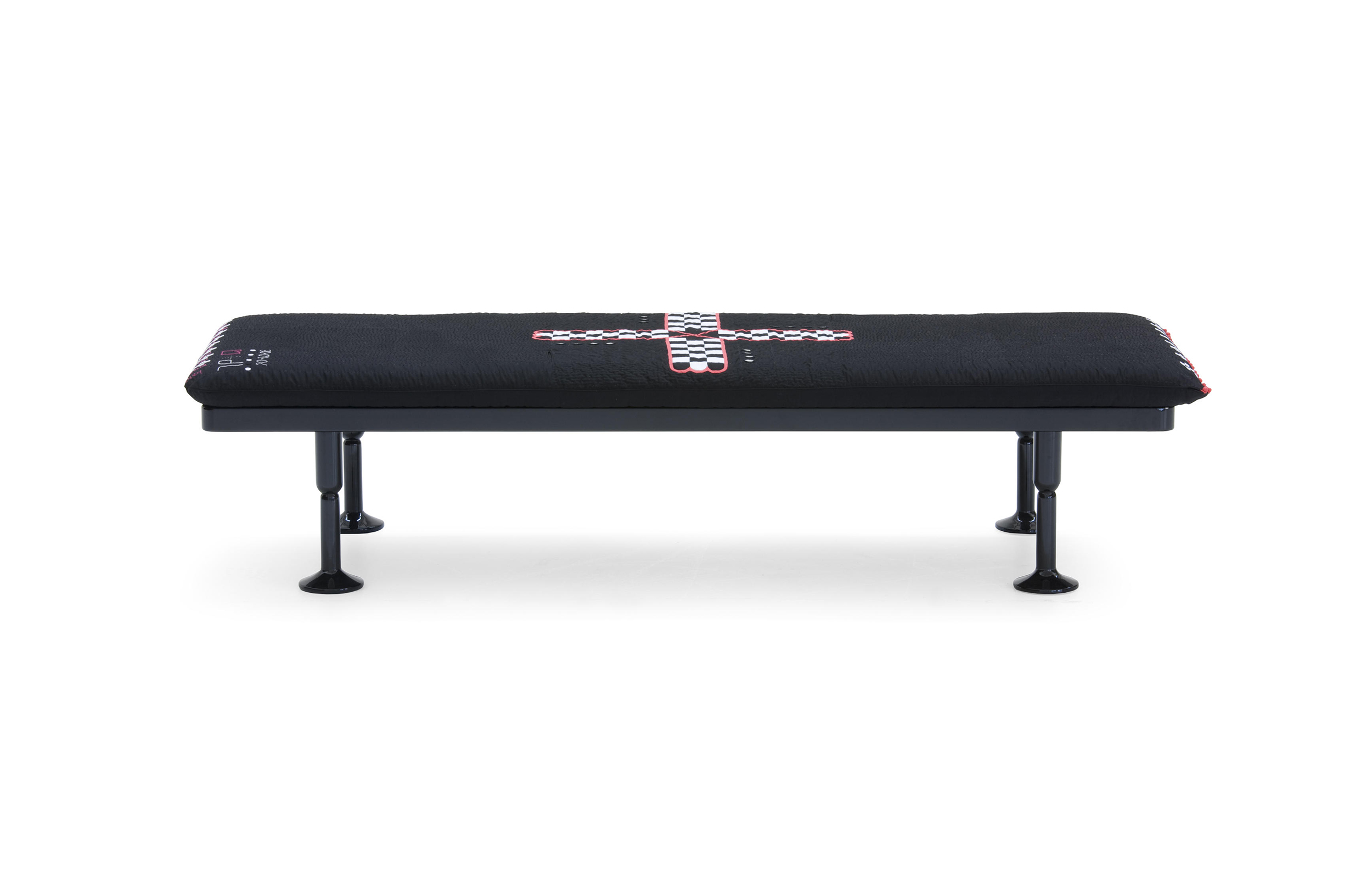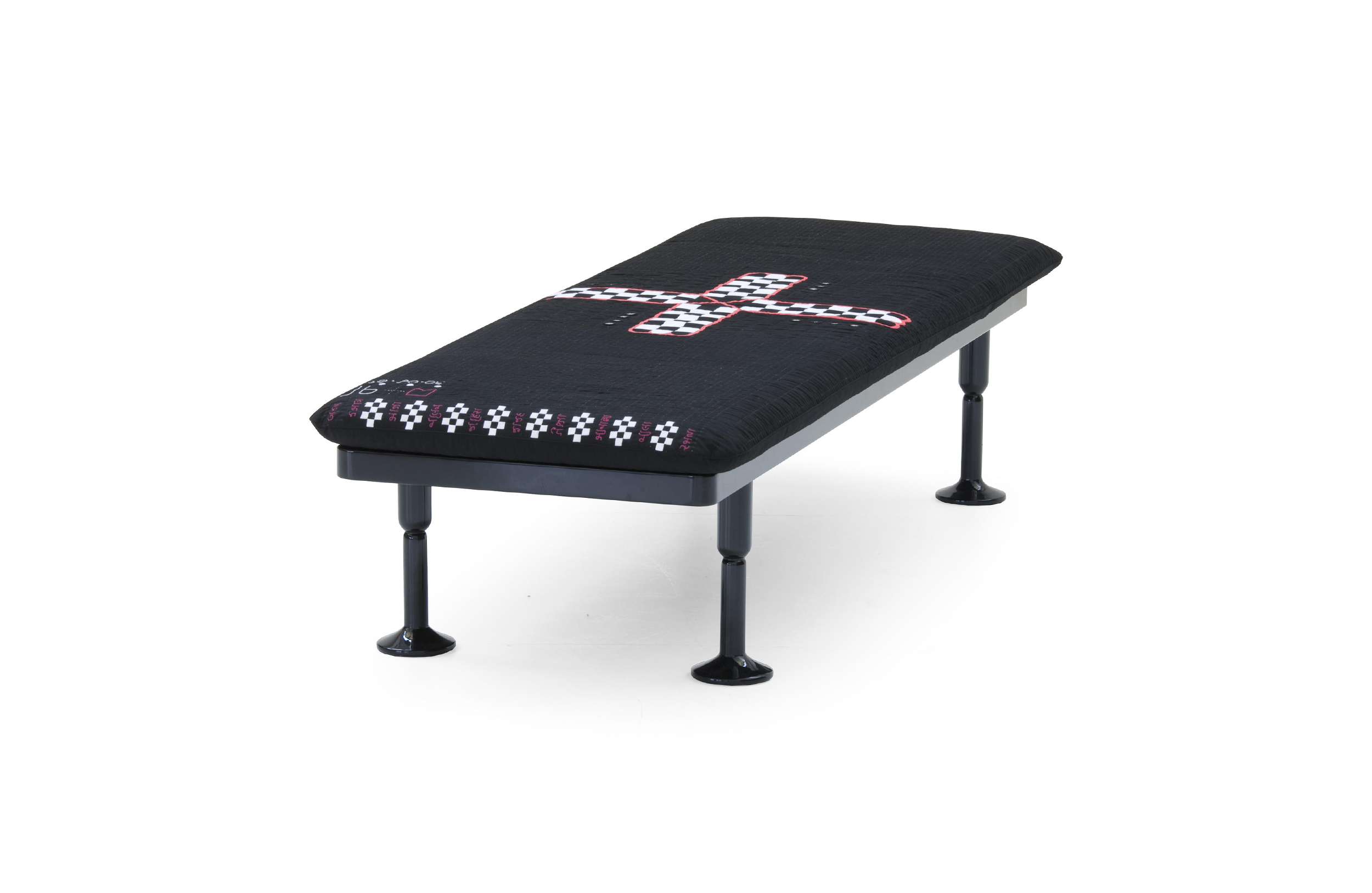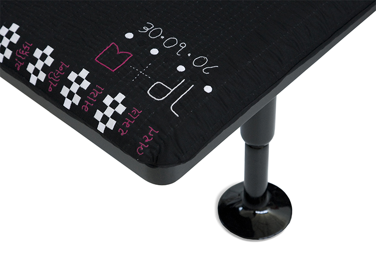 Charpoy,意思是“四条腿”,是对印度大床的反思。Charpoy有一个手工制作的棉花和丝绸床垫装饰由宝贵的手工刺绣。这种装饰是一种游戏的摹本,类似于草稿,在印度,这让人想起了战争时期,王国和妻子被作为赌注赢了。印度轻便床是一种极具价值的物品,它浓缩了手工处理的传统、工艺技巧和丰富程度,与意大利工业生产的黑色漆面与底层木基形成了鲜明的对比。