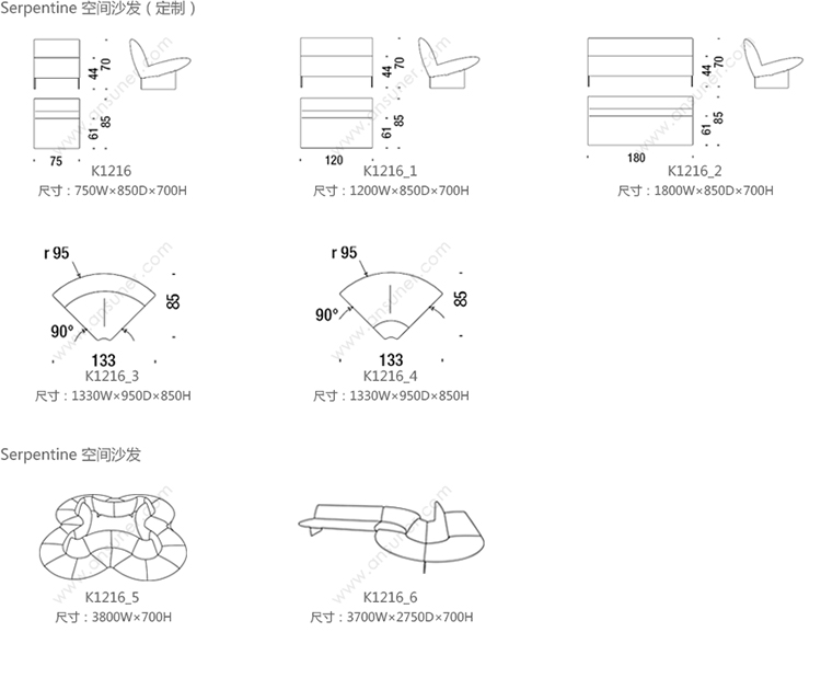 Serpentine 公共沙发 系列尺寸/示意图