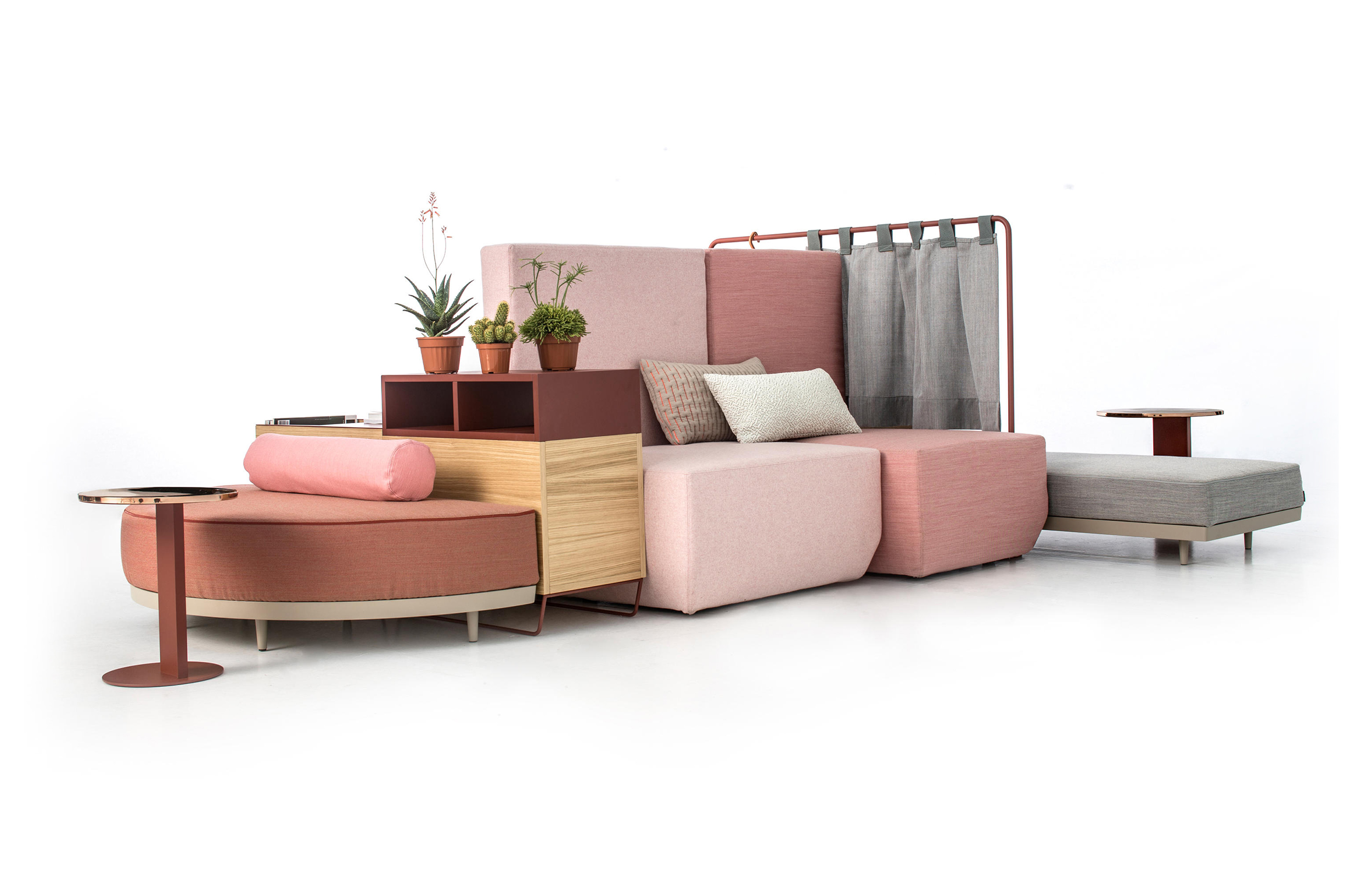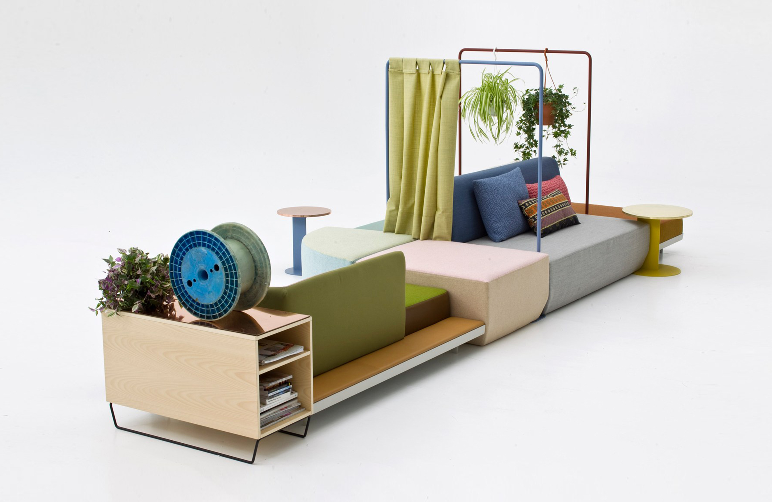 设计相互作用,轨迹控制空间。比基尼是一种风景,它是时代的产物,是它所代表的社会。无论是在等候区还是在家中使用,座位系统是绝对灵活的,因为不需要空间的布局和座位组件的排列。这些组件在外观和功能上各不相同,因此,它们可以在任何设置中使用。凳子、桌子、衣架、容器、架子、屏风、工作台、座椅:每一个元素都结合在一起,创造互动和交流。多种功能和含义的结合意味着沙发作为看电视的家具或简单的休息场所的概念发生了革命性的变化,使它成为互动的核心。