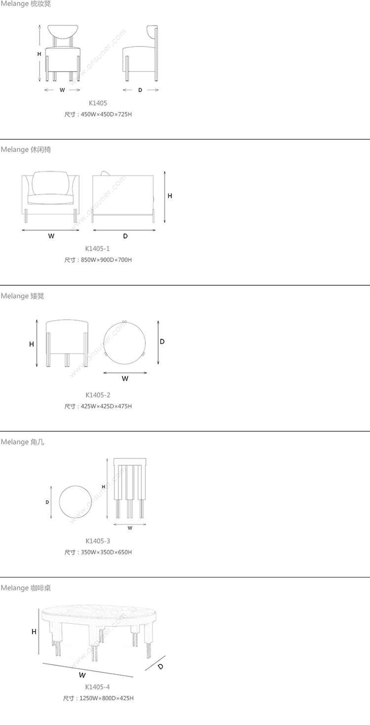 Melange 梳妆凳 系列尺寸/示意图