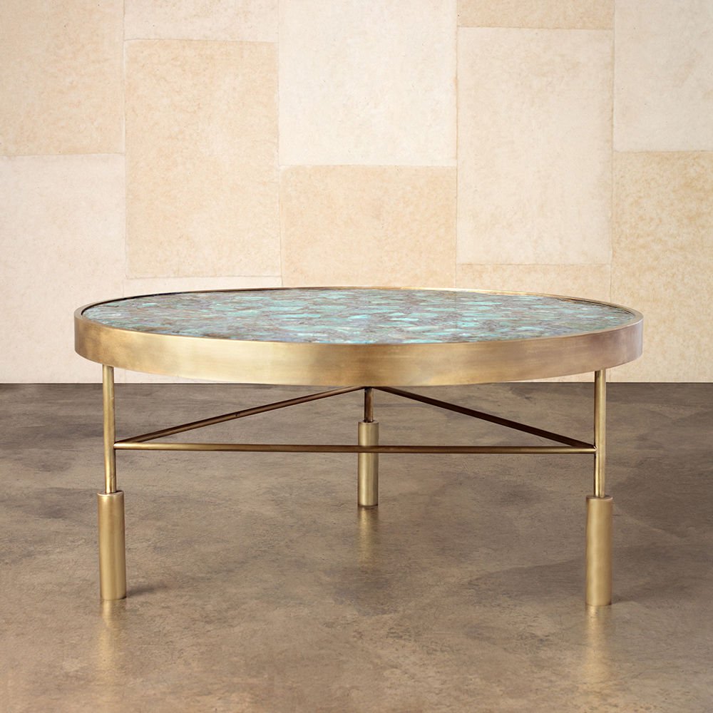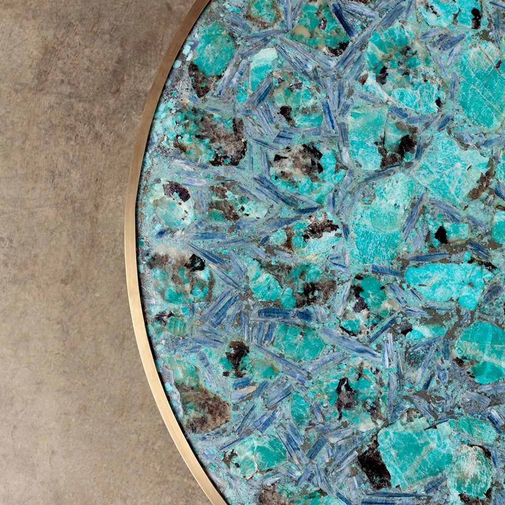 Sedona咖啡桌采用抛光和抛光的半宝石亚马逊石制成,采用抛光黄铜框架。每件作品都是独一无二。