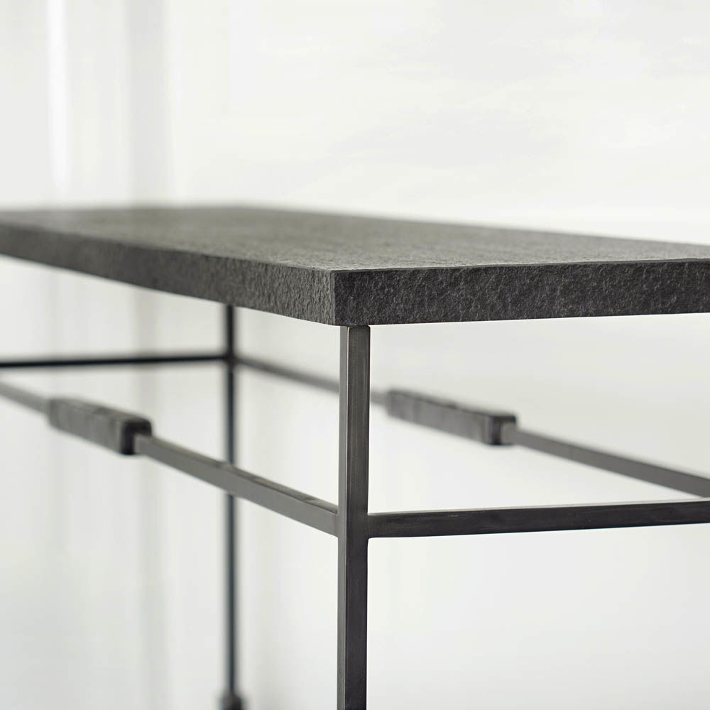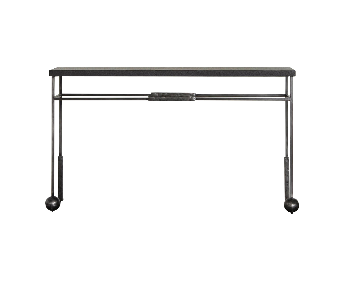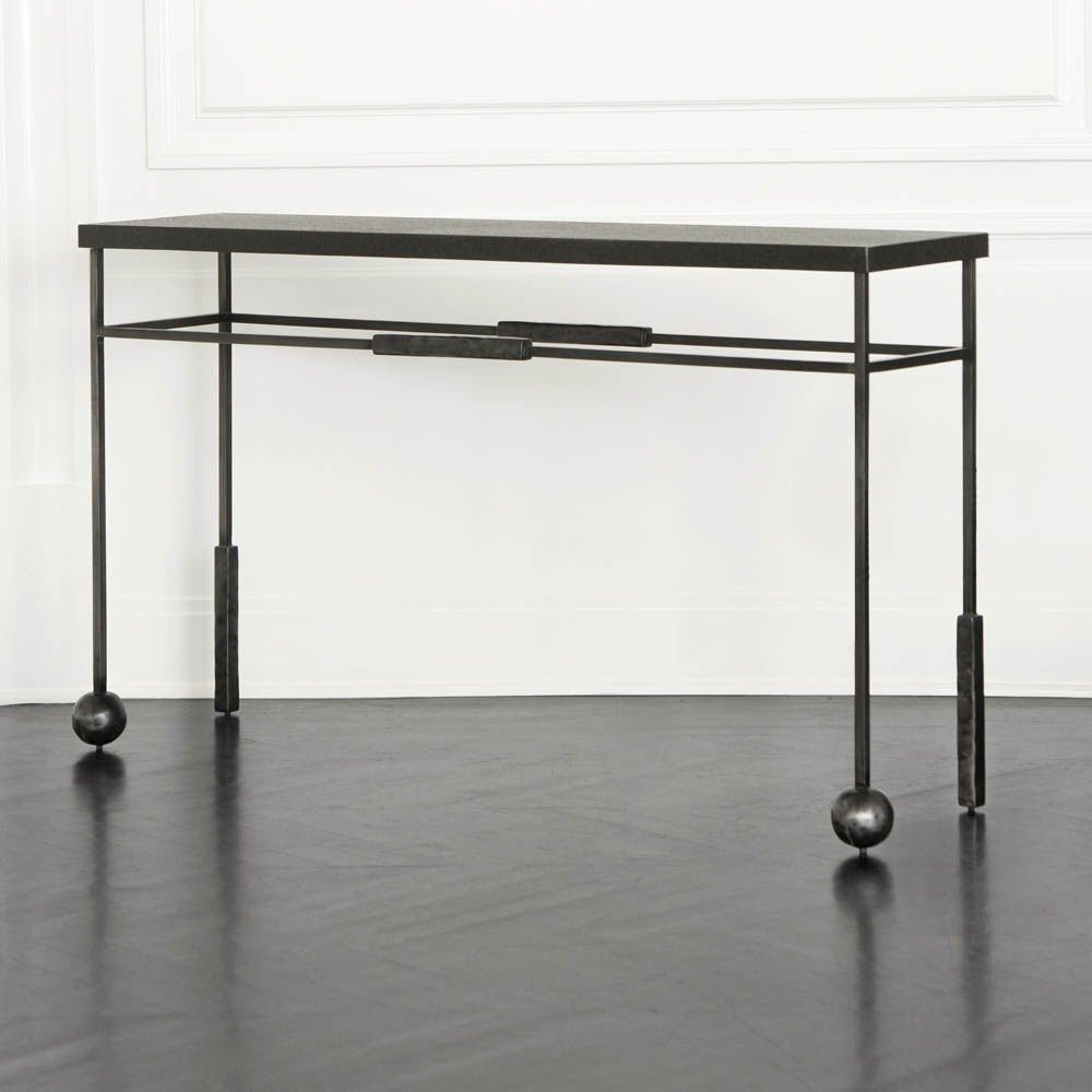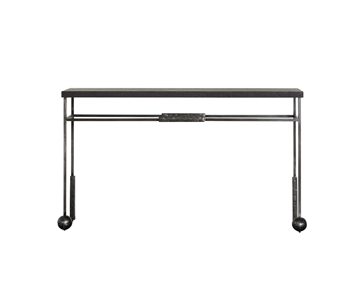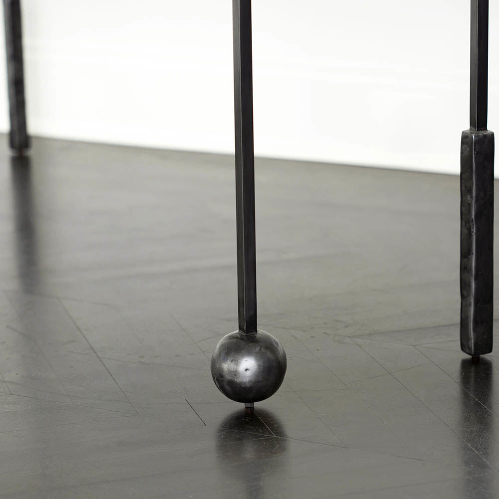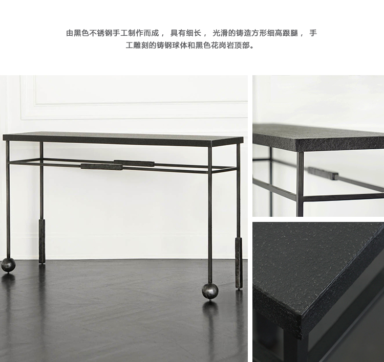 雕塑般的尼姆控制台采用黑色不锈钢制成,具有细长,光滑的铸造方形细高跟腿,手工雕刻铸钢球体和黑色花岗岩顶部。