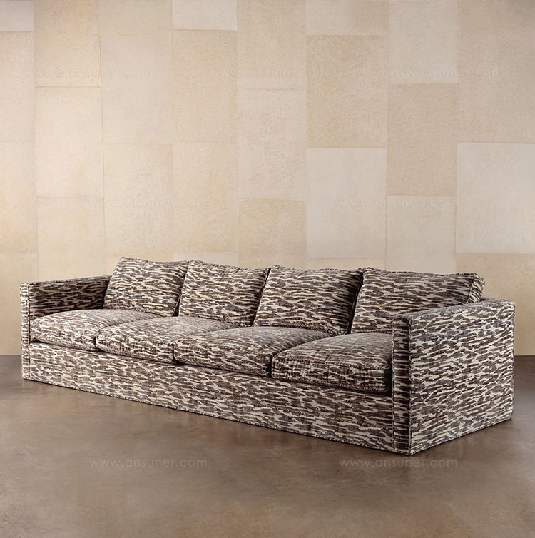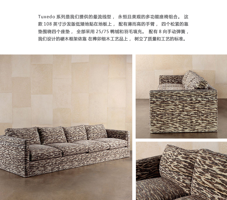Tuxedo系列是我们提供的最流线型,永恒且美观的多功能座椅组合。 这款108英寸沙发版低矮地贴在地板上,配有薄而高的手臂,四个松紧的靠垫围绕四个座垫,全部采用25/75鸭绒和羽毛填充。配有8向手动弹簧,我们设计的硬木框架依靠 在榫卯细木工艺品上,树立了质量和工艺的标准。有各种精选面料和皮革可供选择。
