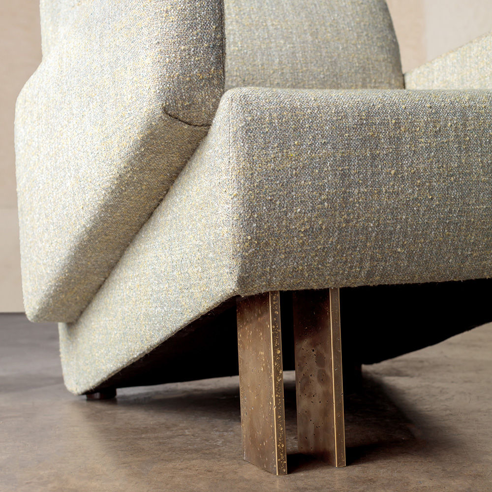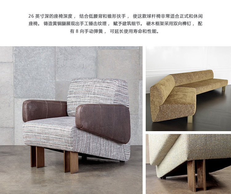 Zephyr Sofa拥有独特的现代和雕塑风格。 26英寸深的座椅深度,结合低腰背和锥形扶手,使这款球杆椅非常适合正式和休闲座椅。 铸造黄铜腿展现出手工锤击纹理,赋予建筑细节。 硬木框架采用双向榫钉,配有8向手动弹簧,可延长使用寿命和性能。