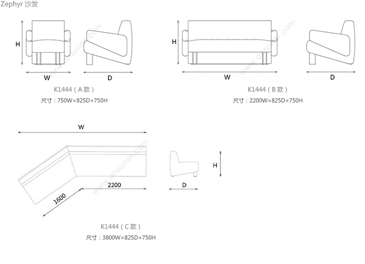 Zephyr 沙发 系列尺寸/示意图