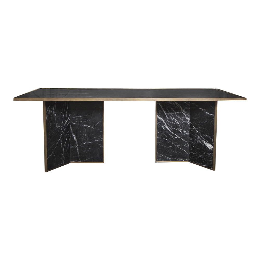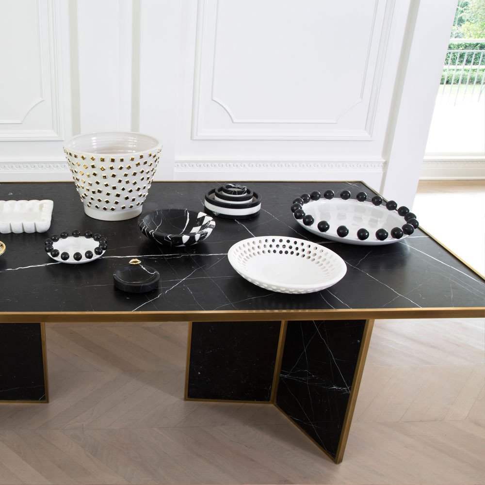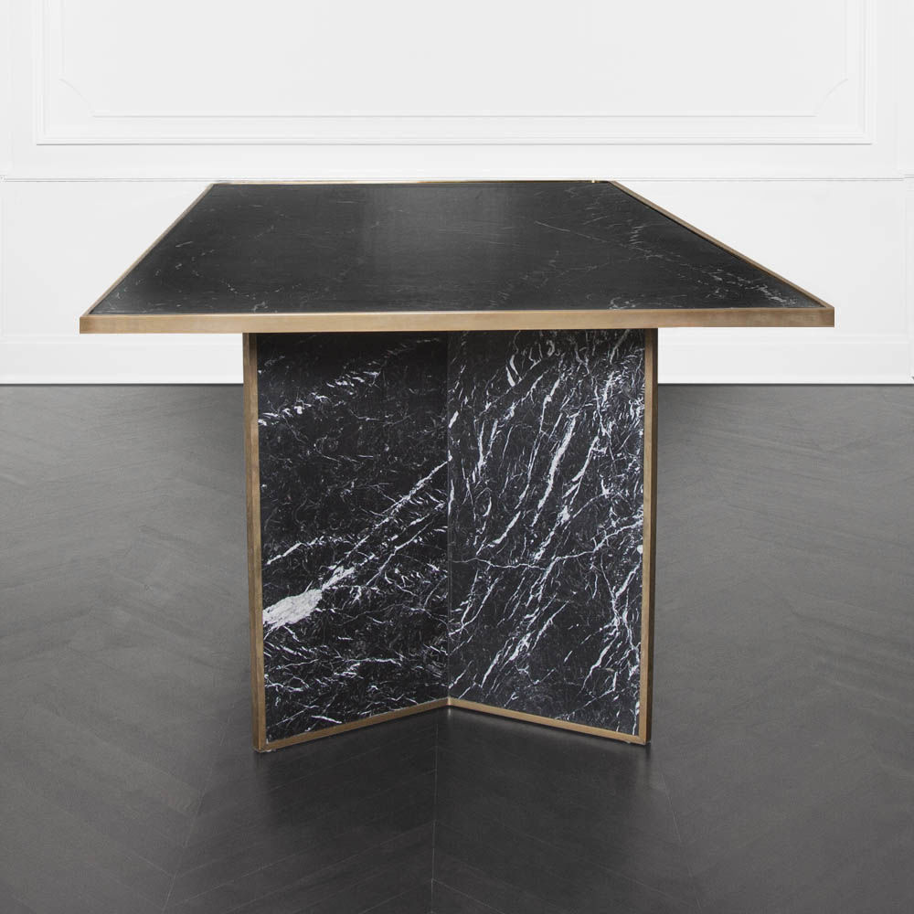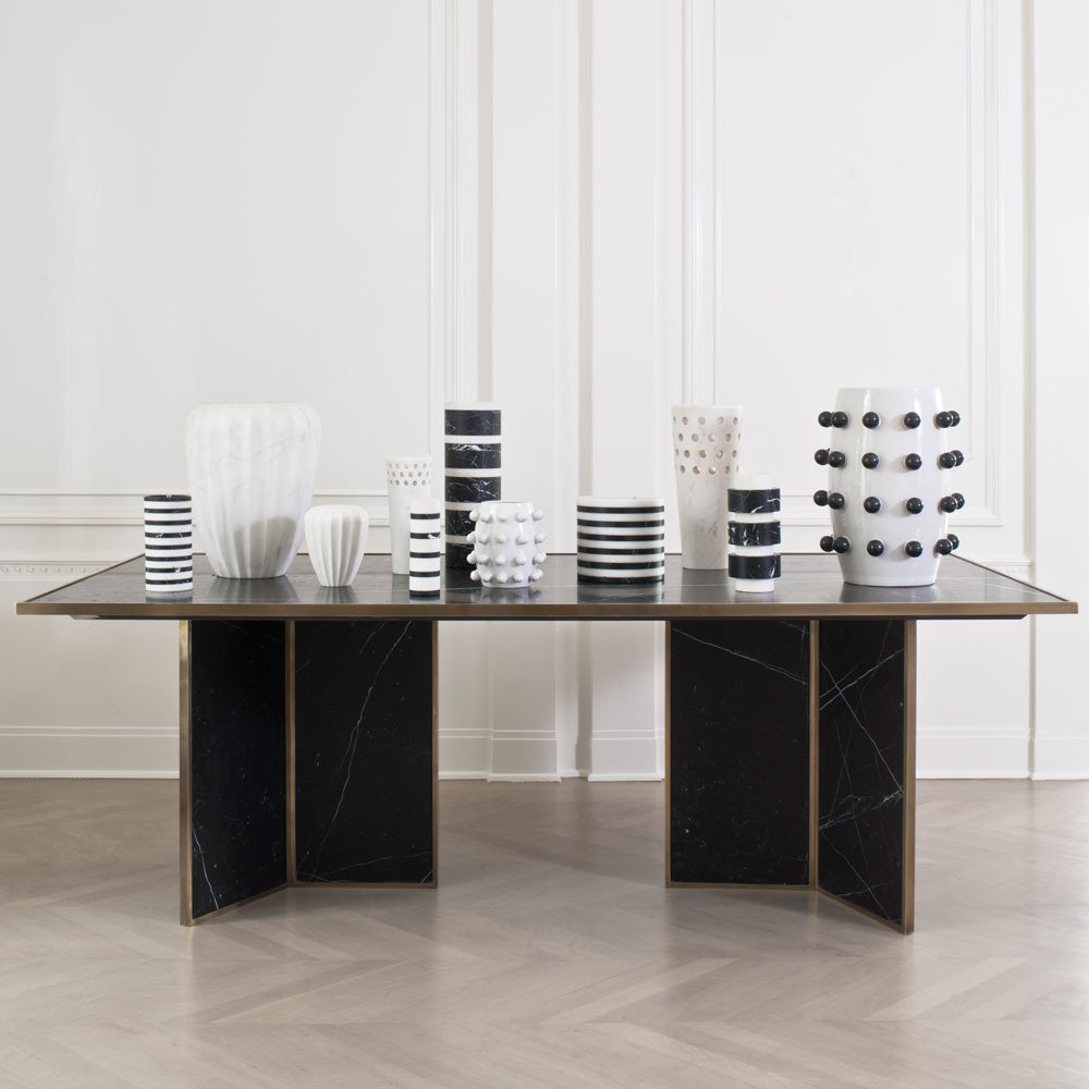 Liaison餐桌具有永恒性和现代感,又体现了凯利对混合材料的热爱。 这款优雅而简约的桌子由巨大的磨砂和密封的黑色Marquina大理石平面组成,饰有古董青铜边缘细节。