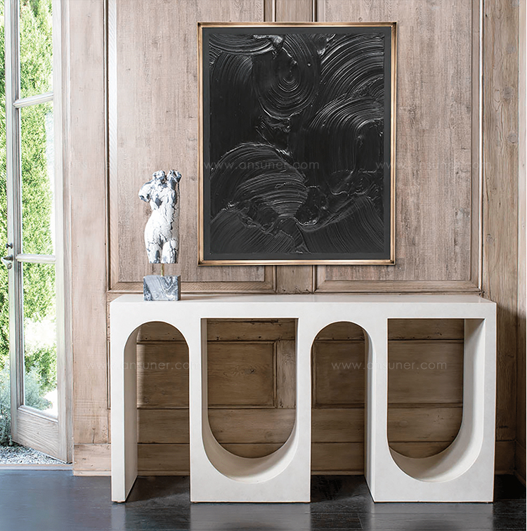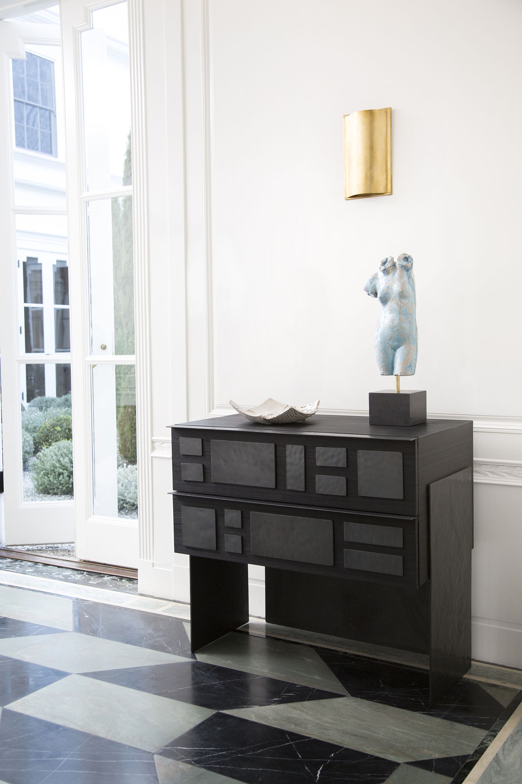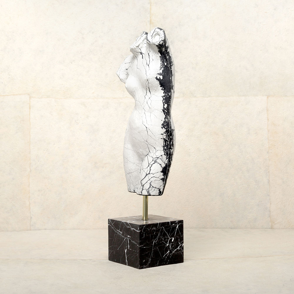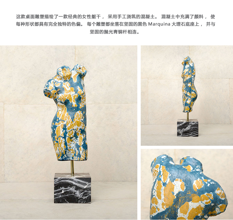 这款桌面雕塑描绘了一款经典的女性躯干,采用手工浇筑的混凝土。 混凝土中充满了颜料,使每种形状都具有完全独特的色偏。 每个雕塑都坐落在坚固的黑色Marquina大理石底座上,并与坚固的抛光青铜杆相连。
