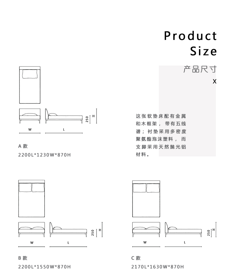这张软垫床配有金属和木框架,带有五线谱; 衬垫采用多密度聚氨酯泡沫塑料,而支脚采用天然抛光铝材料。 可拆卸的外罩采用该系列的面料和皮革。 此型号还提供额外的可拆卸盖板; 对于短版本,脚是可见的,而较长的荷叶边版本到达地板。
