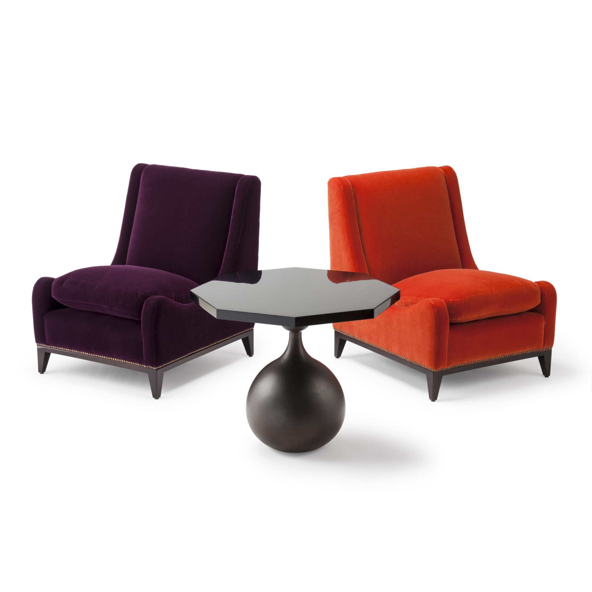 这款Sloop座椅采用Aubergine马海毛制成,配有黄铜指甲油和坚固的美国黑胡桃巧克力黑檀木腿。