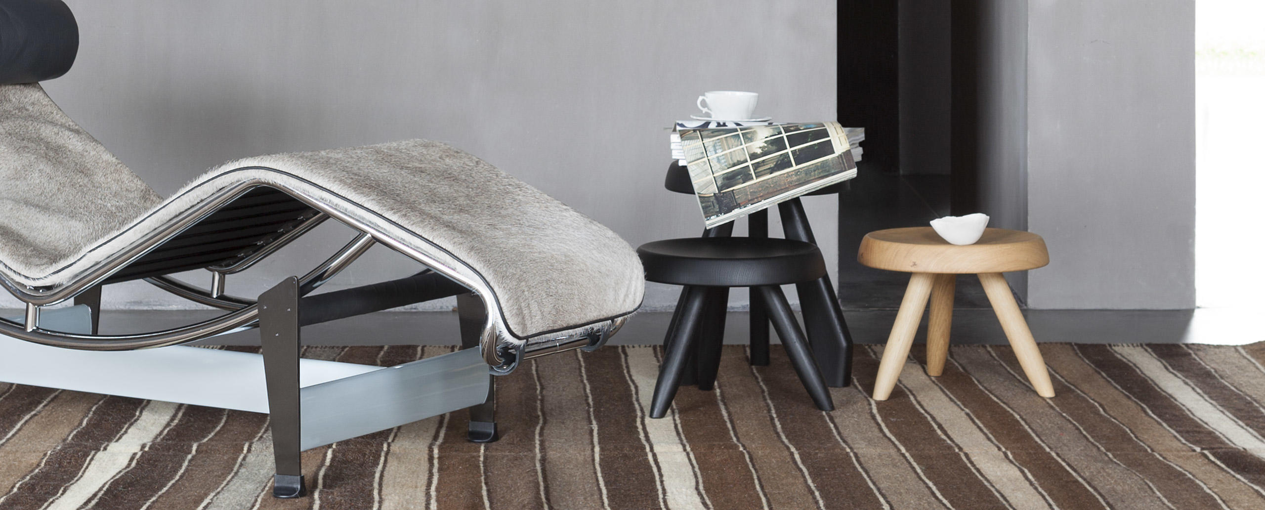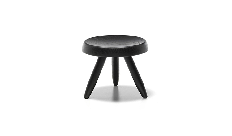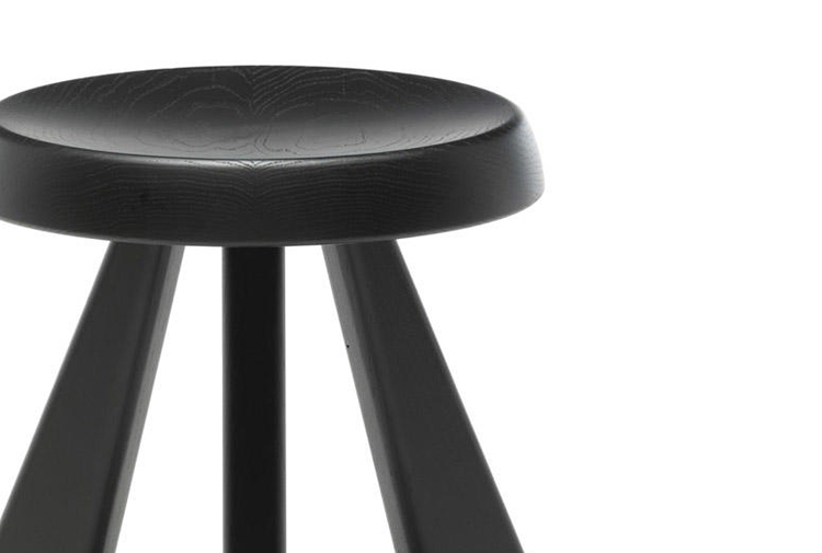 Tabouret Meribel 高脚凳,得名于Charlotte Perriand在法国美贝尔的度假屋。Perriand在这里工作和生活,多年来,她重新诠释了当地的建筑风格。这把凳子材质简单,从阿尔卑斯山的建筑风格中获得灵感。该凳采用三条“刀把型”凳腿,提供三种不同实木饰面:天然橡木、哑光黑色橡木和天然美国胡桃木。